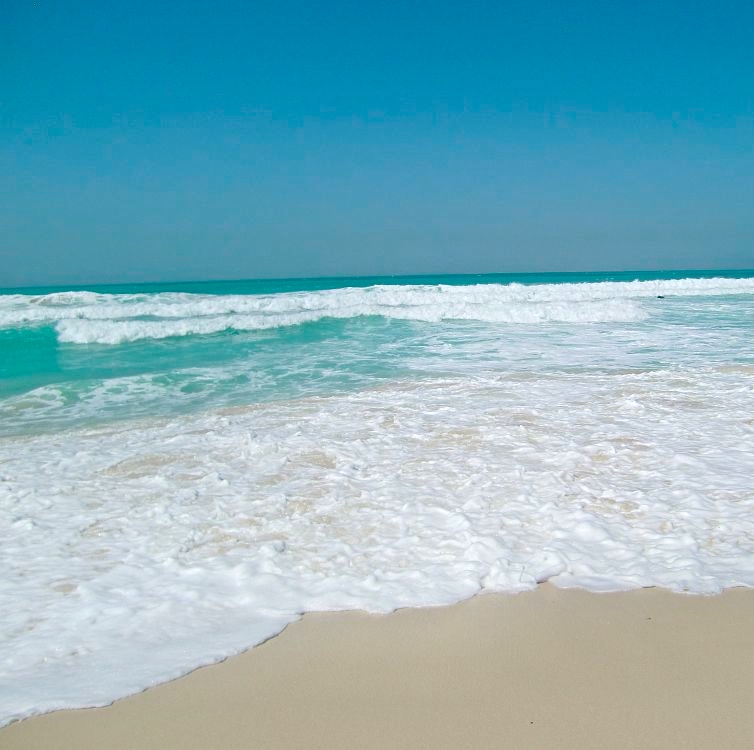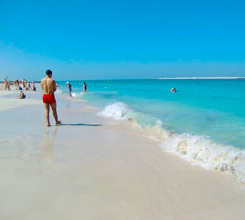 Mutta mitä olisi loma ilman rentouttavaa rantapäivää ja varsinkin, kun Dubai tarjoaa kauniin turkoosin veden ja pehmeän valkoisen hiekan kyseiseen aktiviteettiin. Hotelliltamme oli kuljetus Jumeirah Beach Parkiin, joka on suljettu, maksullinen ranta-alue. Menimme siis sinne ja maksoimme noin 1e sisäänpääsymaksun (5 dirhamia), mikä ei sisältänyt käytännössä muuta, kuin pääsyn alueelle ja rantasuihkut (ja todennäköisesti vessat, mutta emme kokeilleet). Rantatuolista ja varjosta olisi saanut maksaa erikseen, mutta emme viitsineet ottaa niitä muutamaksi tunniksi, mitä meillä oli aikaa oleskella rannalla.