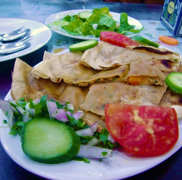 Intialais-arabilaisessa kansankuppilassa tilattua lihalla ja tomaatilla täytettyä leipää, nam! Toisena annoksena kanabiryani.