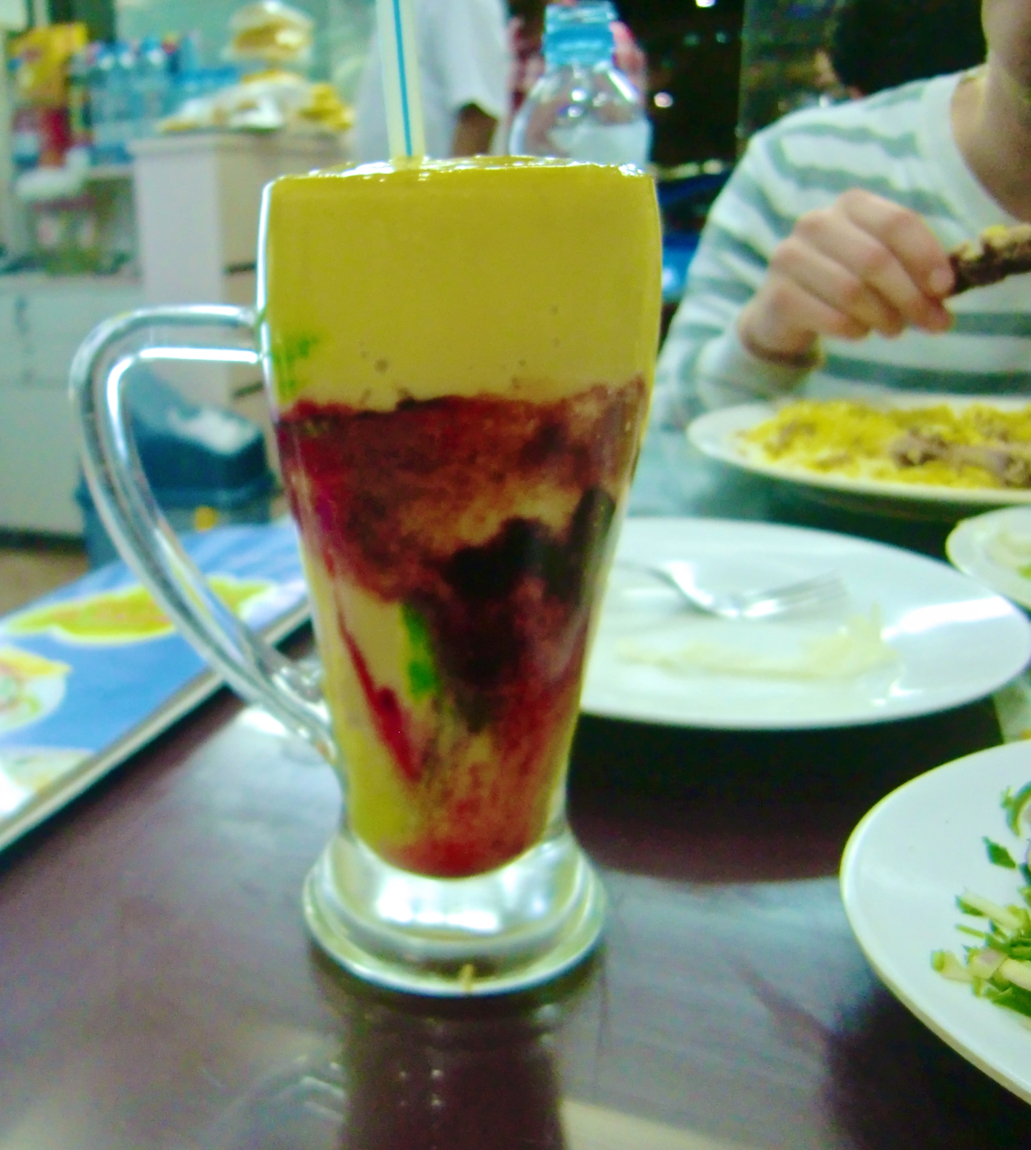 Jälkiruuaksi nari nari -juoma, jossa oli ainakin mangoa, mutta en tiedä mistä nuo muut värit ovat sitten kotoisin!