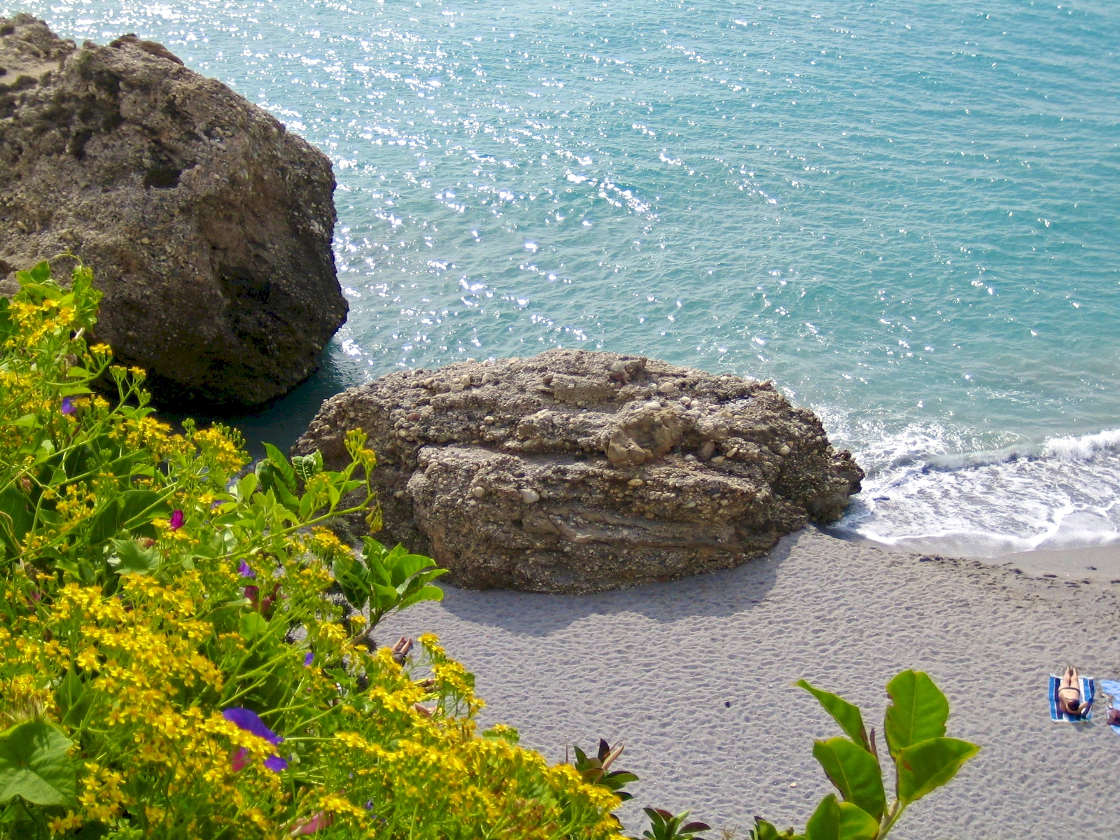 Nerja on kuulu jylhänkauniista rantamaisemistaan. Itse ranta on, kuten kauniit eurooppalaiset rannat yleensäkin, pikkukivinen ja vaalea, mikä luo kivan kontrastin turkoosin meren kanssa. Ainakin sinä päivänä, kun kävimme itse rannalla, oli sen verran aallokkoista, etten olisi itse edes kuvitellut meneväni uimaan. En enää muista, uiko rannalla muut, sillä kyseisellä pikkurannalla oli muutenkin varsin rauhallista syksyllä.