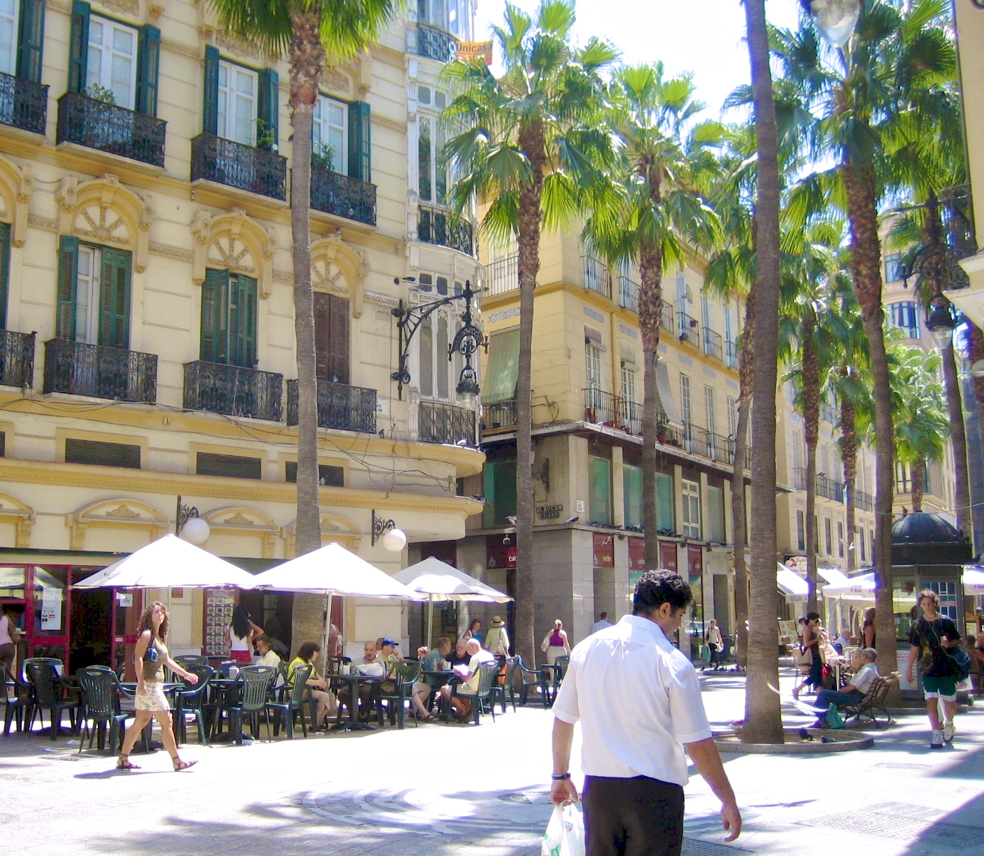 Olipas pitkä intro. Asiaan! Málagan keskustan voisi nähdä koostuvan kahdesta osasta: vanhemmasta ja uudemmasta. Vanhan kaupungin sokkeloiset kujat pikkukauppoineen ja kahviloineen risteilevät ympäriinsä, mutta yleensä on hyvin helppo päätyä jollekin vanhan kaupungin pääväylistä. Pääkävelykatu Marqués de Larios kulkee Málagan pääkadulta, Alameda Principalilta vanhan kaupungin sydämeen päin. Sen päässä on Plaza de la Constitución -aukio, jonka laidalla on kahviloita ja ravintoloita, joiden hinnoissa on otettu huomioon miellyttävät näkymät plazalle.