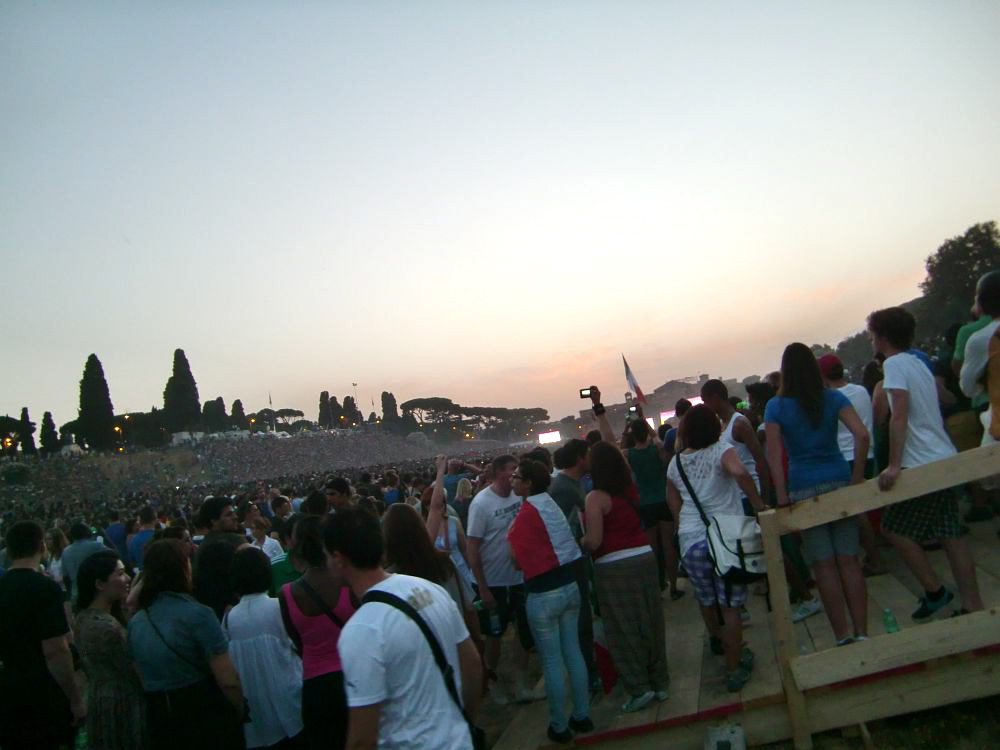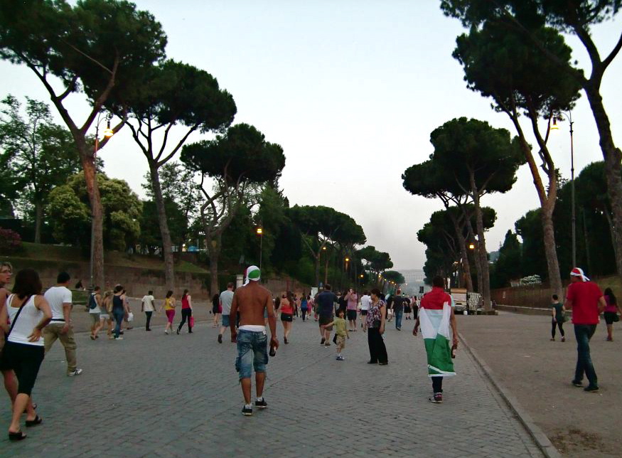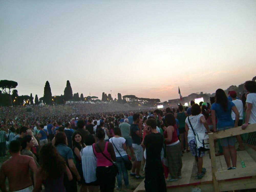 Päädyimme Circo Massimolle (Circus Maximus), missä meitä odotti jo kymmenet tuhannet italialaiset asemoituneina näkemään Italian riemuvoiton. Jättäydyimme itse taakse, sillä emme tulleet katsomaan itse peliä vaan faneja.