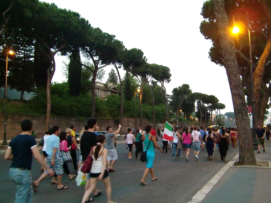 Italia pääsi sitten finaaliin. Aikomuksenamme oli seurata rauhaisasti piazzalla istuen lähibaarien tunnelmia, mutta jalat veivät koko ajan vain isommille vesille sen mukaan, missä Italian liput liehuivat. Päädyimme ensin Colosseumille, missä ihmisvirta oli jo hyvin selkeää ja tunnelma tarttuvaa. Ostimme lähikioskista juomista, sillä pimenemisestä huolimatta ilta oli edelleen lämmin. Sitten seurasimme ihmisvirran mukana meille tuntemattomaan paikkaan.