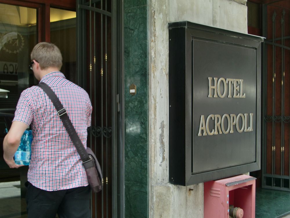 Hotelli Akropoli sijaitsee Terminin aseman välittömässä läheisyydessä, noin kahden korttelin päässä. Sijainti on erinomainen liikkumiseen, sillä molemmat metrolinjat risteävät juuri Terminin kohdalla. Ja tietenkin asemalta lähtee suuri määrä busseja ja muutama ratikkalinja. Sijainti oli myös siksi hyvä, että ympäristössä on paljon edullisia ruokapaikkoja, eikä ravintolaa tarvitse todellakaan etsiä. Lisäksi mikäli sää olisi ollut viileämpi, olisi hotellilta pystynyt kävelemään monien nähtävyyksien luokse.