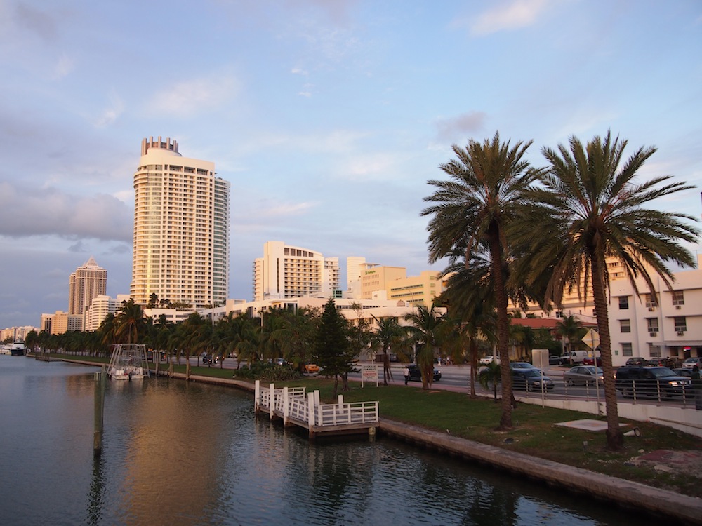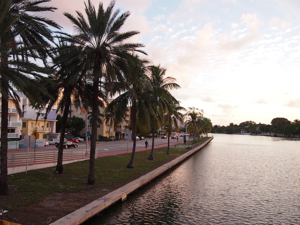 Mid Beachin bussipysäkkimme ympäristö oli kaunista varsinkin iltaisin, kun aurinko alkoi laskea kanaalin taakse. Miamin seutu on muuten täynnä kanaaleja ja seutu näyttää hauskalle varsinkin yläilmoista käsin, kun vettä on joka puolella.