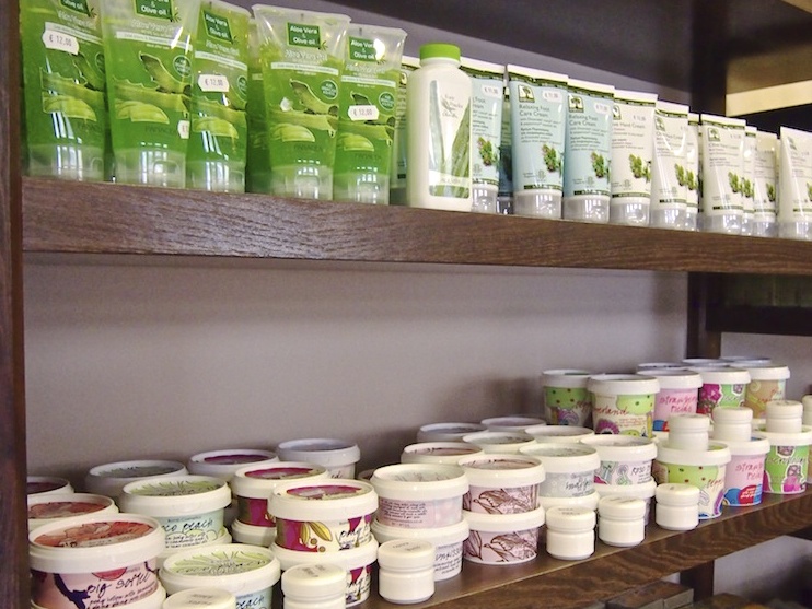Kolmas superlöytö oli ihana pieni kauppa, jossa myytiin paljon erilaisia saippuoita, voiteita ja kuorinta-aineita. Kaikki söpöissä pakkauksissa ja erityisesti ostamani lime-karpalo -kuorintavoide minisankossa oli niin vastustamattoman tuoksuinen, että olisin voinut raahata kotiin useammankin. Oliiviöljysaippuat on tietenkin ihan pakollisia Kreikan tuomisia. Liikkeen omistajan koira oli muuten ihan supersöpö, sillä se ei saanut astua jalallaan kauppaan, joten se istui avonaisen oven edessä ja tuijotti kaihoisasti kaupan sisään: