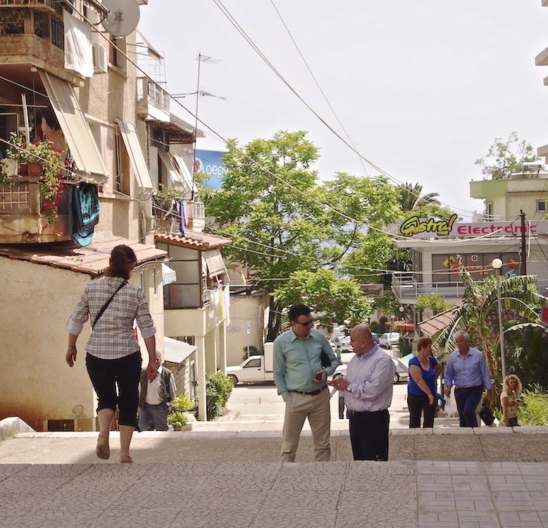 Seuraava pysähdys oli läheinen Sarandan rannikkokaupunki, joka on käsitykseni mukaan myös Albanian suosituimpia turistikohteita. Lounastimme yhdessä kaupungin parhaista ravintoloista, jonka terassilta oli hienot näkymät rannalle. Ja ruokakin oli varsin hyvää, sekoitus italialaista ja kreikkalaista (kreikkalaistyyppistä salaattia alkuruuaksi ja tomaattipastaa pääruuaksi). (Edellisellä reissulla nautin kyllä erittäin hyvää albanialaista ruokaa).