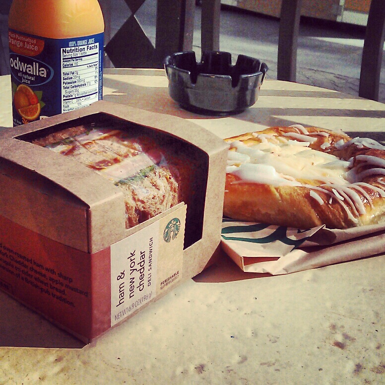 Söimme ensin aamupalaa hotellimme Starbucksilla. Tiskistä valittu New York kinkku+cheddar -leipä ei ollut kovin kummoinen, mutta cheese danish sitä vastoin oli herkullinen. Tosin emme jaksaneet syödä sitä edes puoliksi, niin valtava se oli (kuten kaikki ruuat täällä).