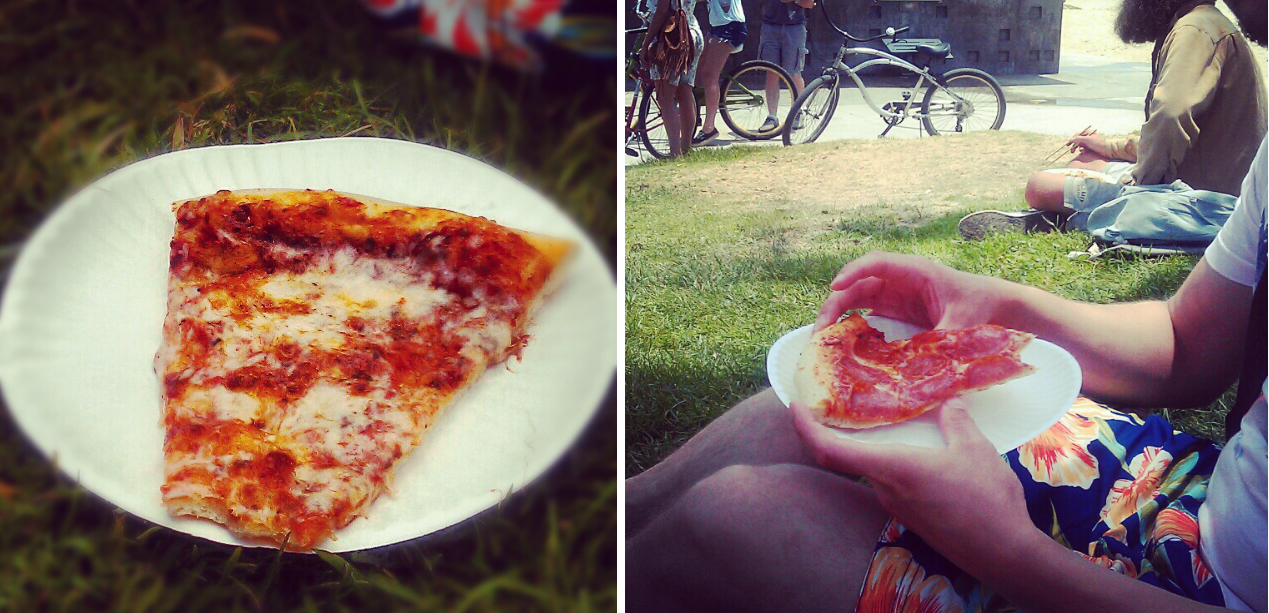 Muutaman tunnin rantalekottelun jälkeen päätimme lähteä kävelemään Venice Beach Boardwalkia pitkin. Nappasimme heti alkumatkasta pizzaslicet ja menimme syömään niitä ruohikkoiselle kaistaleelle kävelykadun ja rannan väliin. Istuimme palmun varjossa ja seurasimme samalla omalla väylällään kiitäviä pyöräilijöitä ja rullaluistelijoita (täällä on kaikilla sellaiset periamerikkalaiset retropyörät, usein ihanan kirkkaissa väreissä). Tunnelma olisi ollut lähes täydellinen, ellei viereisen palmun alla istuva nutcase olisi alkanut avautumaan meille ja koko maailmalle…