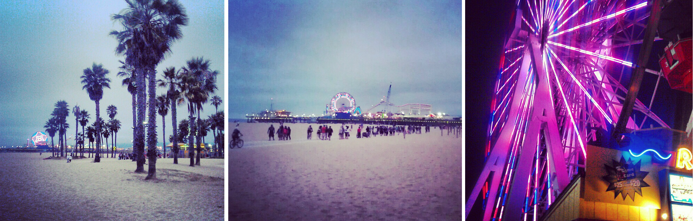 Wendy´sin jälkeen suuntasimme samalle parkkipaikalle kuin aamupäivästä, koska meillä oli parkkiaikaa vielä puoleen yöhön asti. Kävelimme Venice Beachin päähän ja lähdimme tällä kertaa Santa Monicaan päin, sillä halusimme kävellä kuuluisalle Santa Monican laiturille. Matkaa tuli reilu 2km suuntansa ja se oli miellyttävää käveltävää, sillä ilta alkoi hämärtyä kauniisti, ihmisiä oli paljon liikenteessä ja rannalla on hyvä kävelykatu.