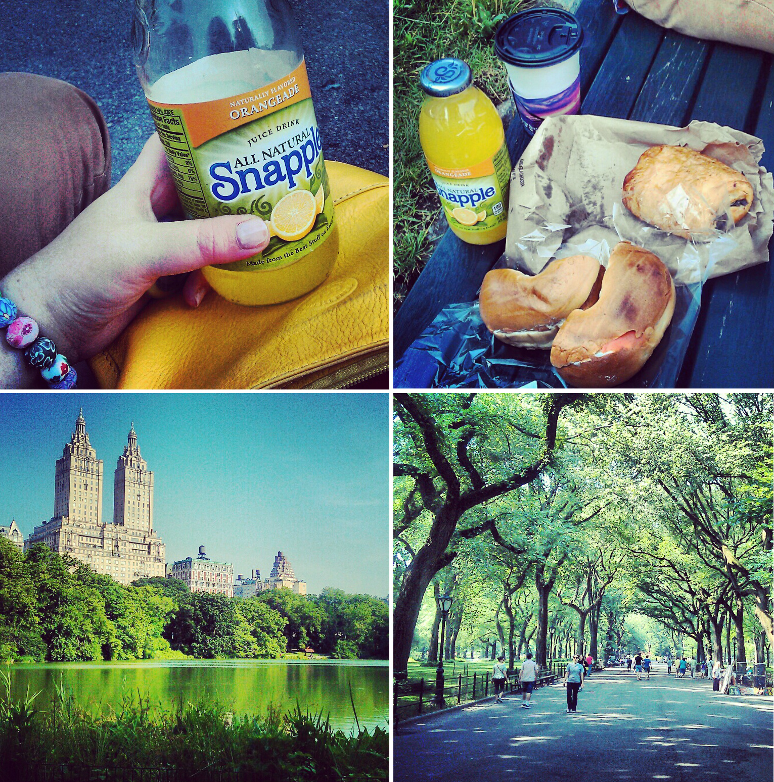 Suuntasimme ensin kahvilaan hakemaan evästä: täytetty bageli, suklaacroissantti, mehua ja kahvia. Ja sitten metrolla Central Parkiin, tarkemmin ottaen 72. kadun asemalle, josta kävelimme Strawberry Fieldsin läpi The Lake:lle. Söimme aamupalaa hienoissa puistomaisemissa ja lueskelimme muutamia puistonpenkkien ”omistuskirjoituksia”. Kävelimme järven rantaa pitkin Bethesda Terracelle, josta jatkoimme vielä The Mall -puistokadulle. Central Parkin maisemat olivat jälleen kerran huikaisevan hienoja, ja vaikka tämä oli kolmas kerta kyseisessä puistossa, emme olleet liikkuneet näillä seuduilla kertaakaan aikaisemmin.