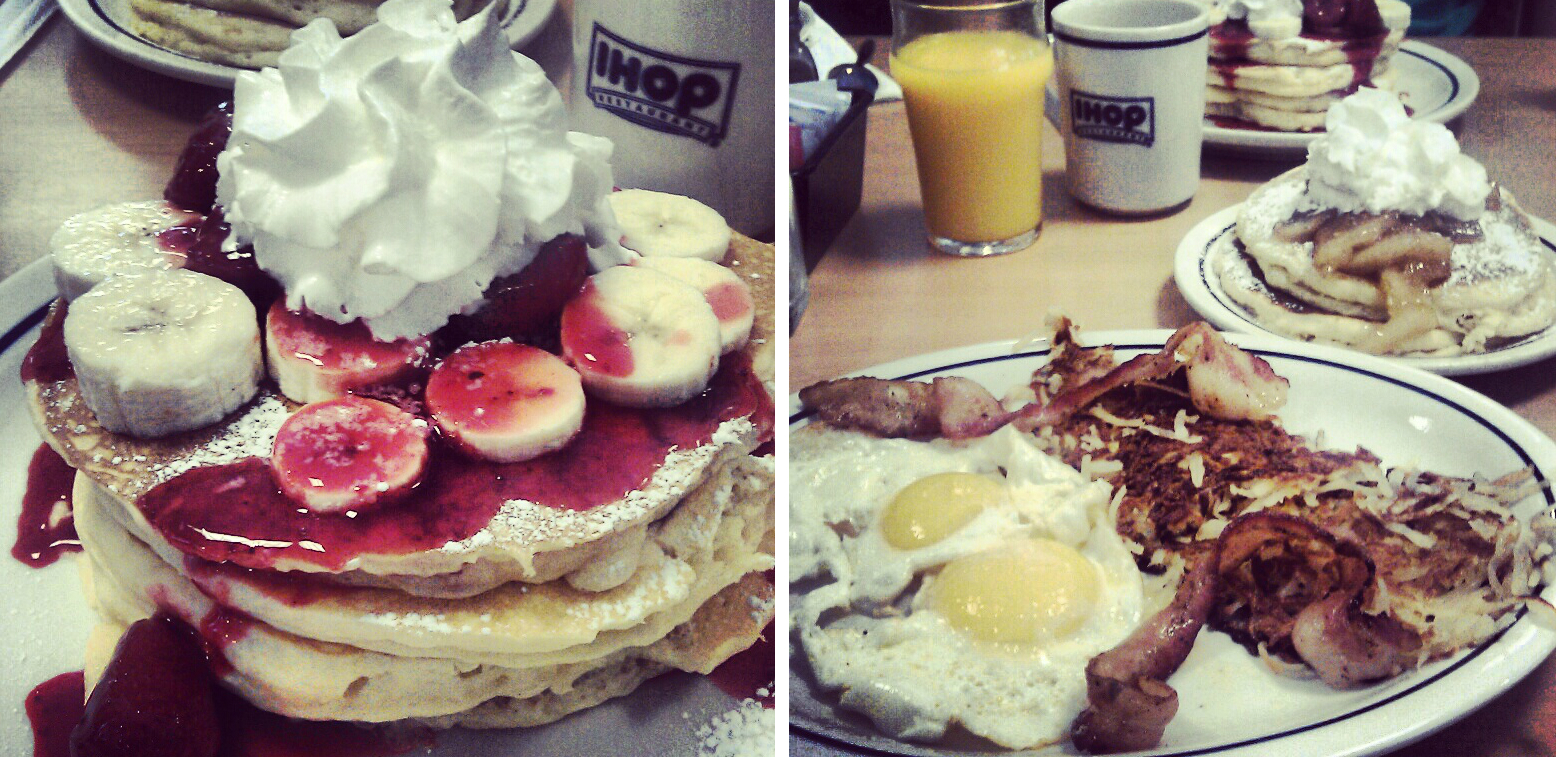 Ja mikä on pehmeämpi lasku sirkusmeininkeihin kuin kunnon aamupala. Meillä oli aiemmin tarkoitus käydä syömässä Ihop:ssa (International House of Pancakes), mutta pääsimme toteuttamaan sen vasta nyt. Ja saimmekin vatsamme täyteen ja hieman enemmänkin, sillä minä ei-aamupalaihminen intouduin tilaamaan oikein combo-annoksen, jossa oli kananmunia, pekonia, hash brownseja ja pannareita (omena-kaneli). Mies valitsi isomman pinon pannareita mansikoilla ja banaanilla. Oli hyvää!