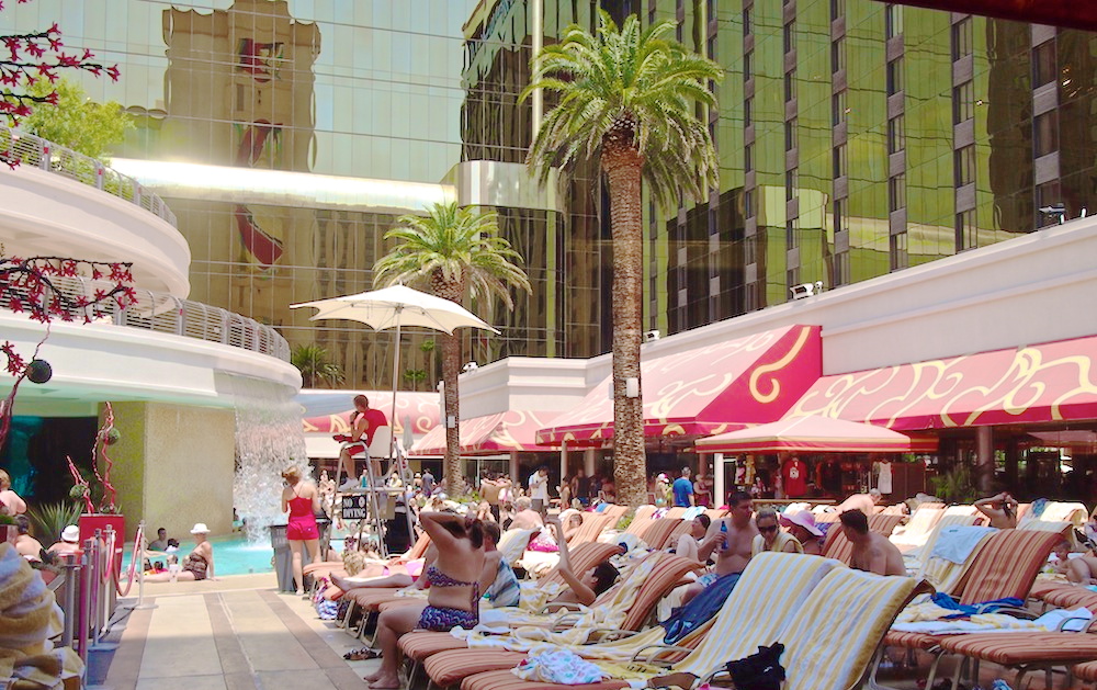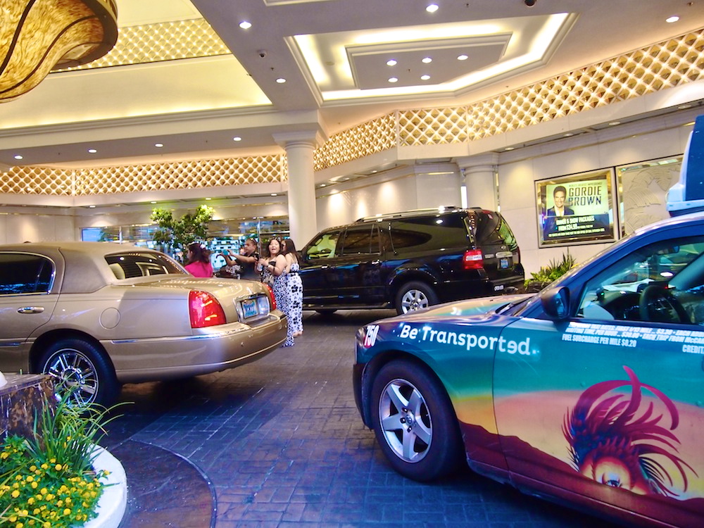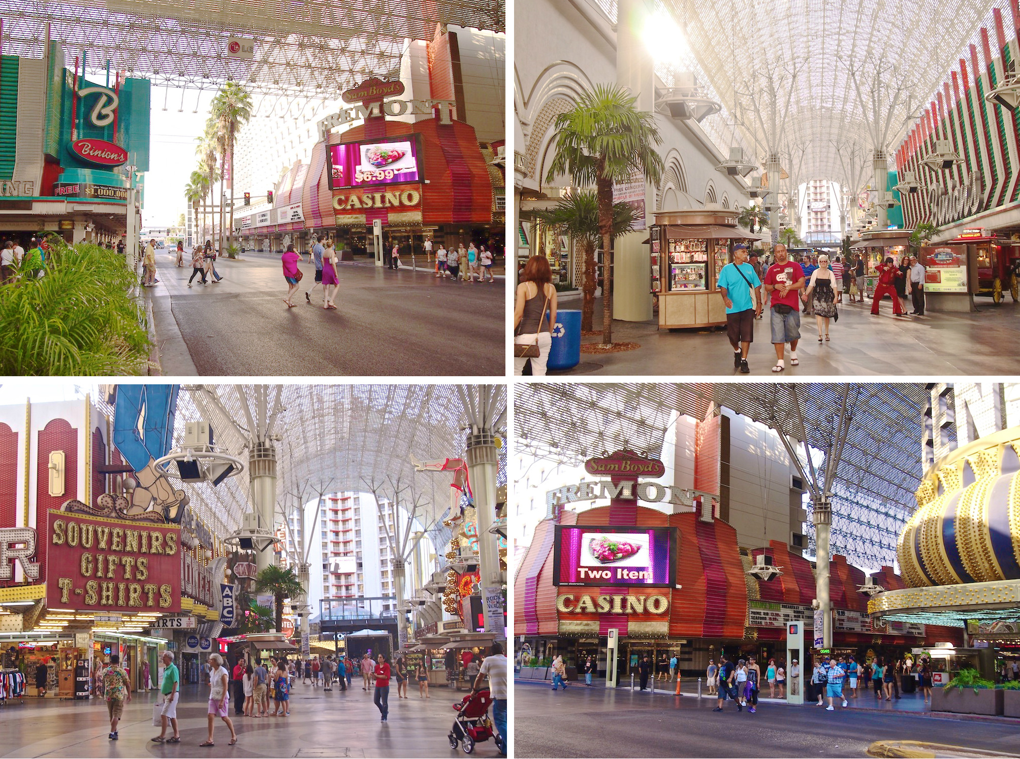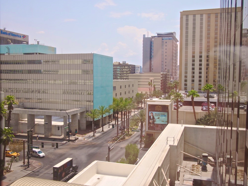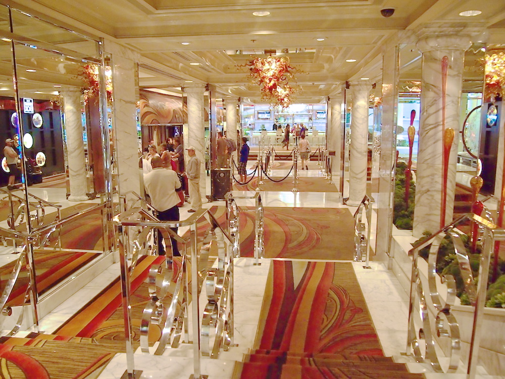 Kipaisimme kuitenkin pääovista ulos, ohi pikkoloiden, kultaisten kärryjen ja limusiinien. Perusjuttuja Vegasissa. Kävelimme tukahduttavassa kuumuudessa korttelin toisella sivulla olevalle katetulle kävelykadulle, jonka katto on ylhäällä korkeuksissa ja sivut osittain auki, mutta joka on käsittämättömällä tavalla onnistuttu ilmastoimaan.