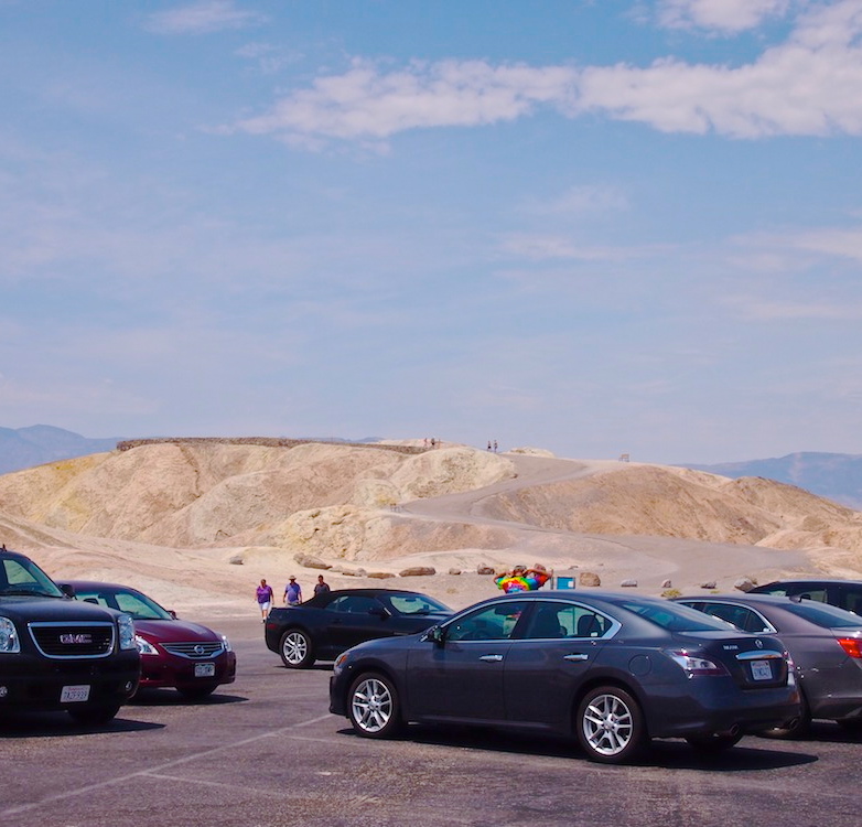 Ennen Furnace Creekiä huomaamme yhden päivän kohteistamme: Zabriskie Pointin. Päätämme pysäyttää heti ja käydä ihailemassa maisemia. Auton mittari näyttää huimaa 52 asteen lämpötilaa eikä se tunnu yhtään liioitellulta, sillä ilma on kuuma kuin saunassa ja tuuli on kuin täysillä pauhaava fööni, joka polttaa ihoa.