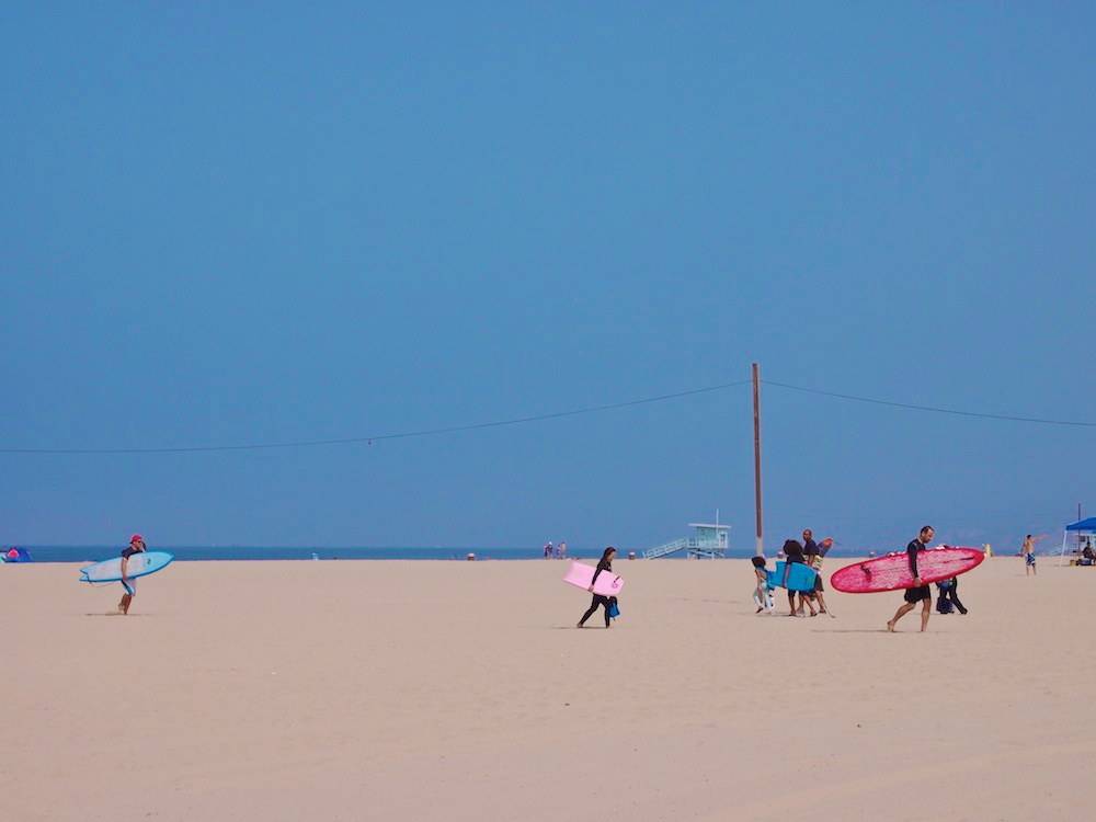 Ranta ei ole mikään maailman hienoin, vaikka hiekka onkin ihanan pehmeää ja meressä pystyy uimaan ken tarkenee. Mutta tunnelma rannalla on kaikkenensa omalaatuinen, sillä ranta on hyvin vilkas ja siellä harrastetaan vaikka mitä. Päällimmäisenä mieleen jäi rullaluistelijat ja ihanilla amerikkalaisilla retropyörillä ajelevat kaikenikäiset ihmiset rantakadulla. Venicen kohdalla koko homma muuttuu pieneksi sirkukseksi ja toinen toistaan värikkäämmäksi myyntikojuksi, kun taustalla on iso skeittiparkki sinistä merimaisemaa vasten ja toisaalla pelataan katukorista. Venicen boardwalkista lisää seuraavassa postauksessa!