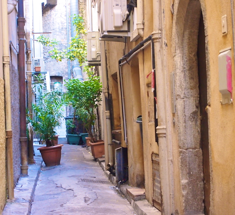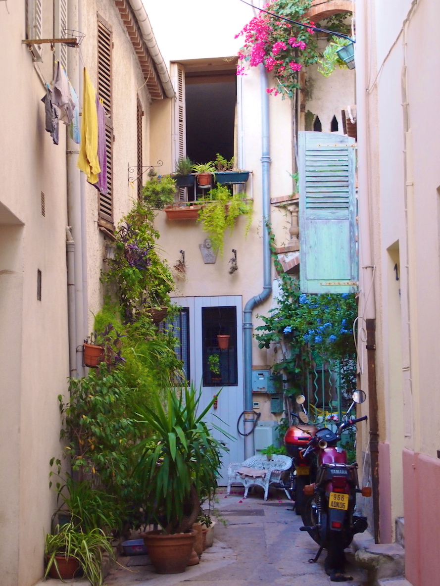 Toisella kerralla olin yksin ja kiertelin aikani kuluksi epämääräisesti haahuillen vanhan kaupungin kapeita kujia. Yksin matkustaessa on ihanaa, kun voi jäädä tarkastelemaan ihan tyhmiäkin juttuja ilman, että pitää selittää toiselle, että ”mä nyt haluan vähän aikaa katsella tätä, koska…”. Tosin enpä löytänyt mitään tyhmää Antibesistä. Ihania kauniita yksityiskohtia siitäkin edestä. Kapeat kadut luovat aina moniulotteista tunnelmaa yhteen pieneen kuvaan!