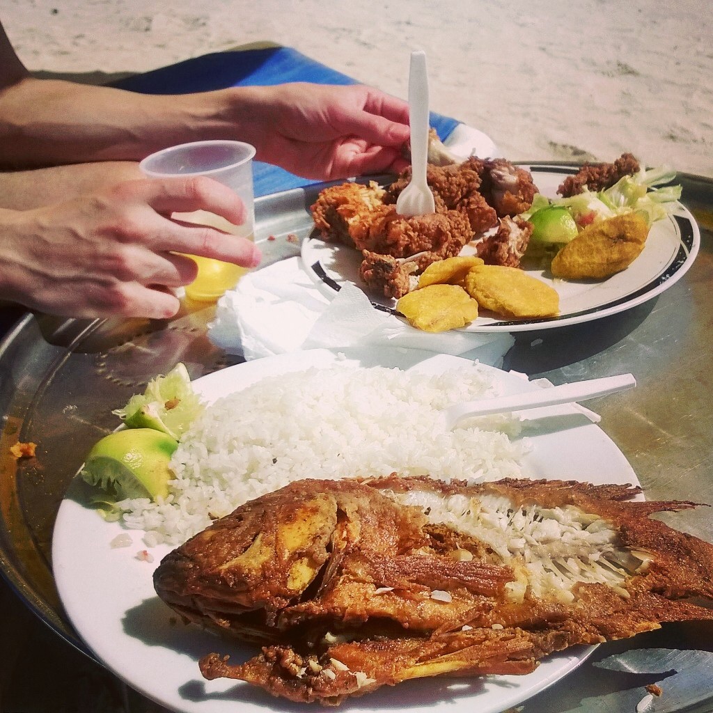 Kala oli ihan mielettömän hyvää! Vaikka kokonainen kala oli pelkästään minulle, söin sen ihan kokonaan. Limettiä päälle ja sormin särpimään! Avokadosta annoksessa ei kyllä ollut tietoakaan, pieni salaatti siinä oli ja iso annos riisiä (tietenkin, siitä ei taida päästä eroon edes maksamalla). Miehen annoksen kana oli myös hyvä ja hänellä pienen salaatin lisäksi annoksessa oli friteerattuja jauhobanaaneja, mikä on tyypillinen lisuke täällä.