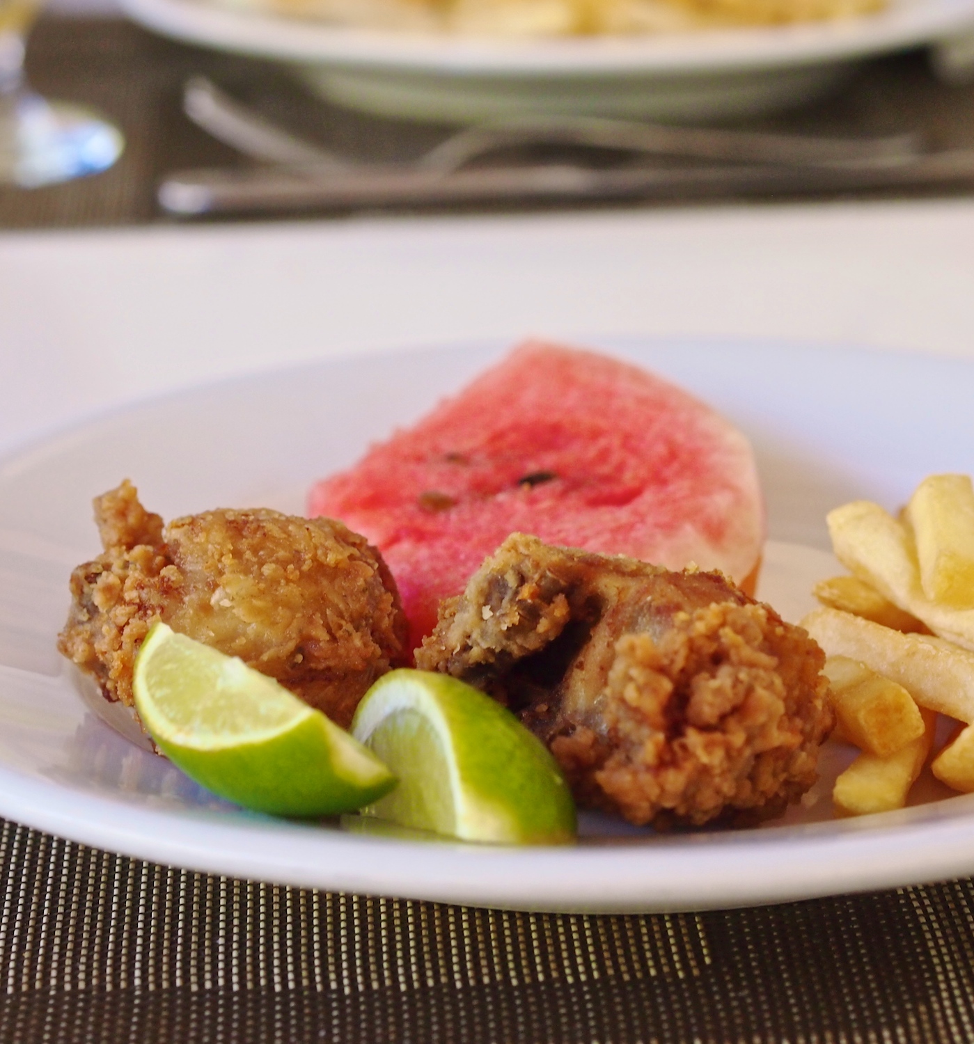 Ihastuin erityisesti kikhernesalaattiin, jota söin kahtena päivänä. Se oli ihanan limettistä ja raikasta! Rantabuffetin parasta tarjontaa oli tietenkin itse kasatut hampurilaiset, joihin kokki paistoi pihvejä grillissä. Väliin paljon mietoa, tuoretta sipulia ja tomaattia sekä sinappia ja ketsuppia. Niin yksinkertaista, mutta niin hyvää! Myös friteerattu kana limetin mehun kanssa oli hyvää ja rapeaa, vaikka buffet-ruokaa olikin.