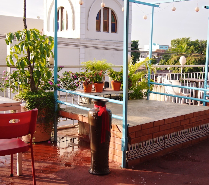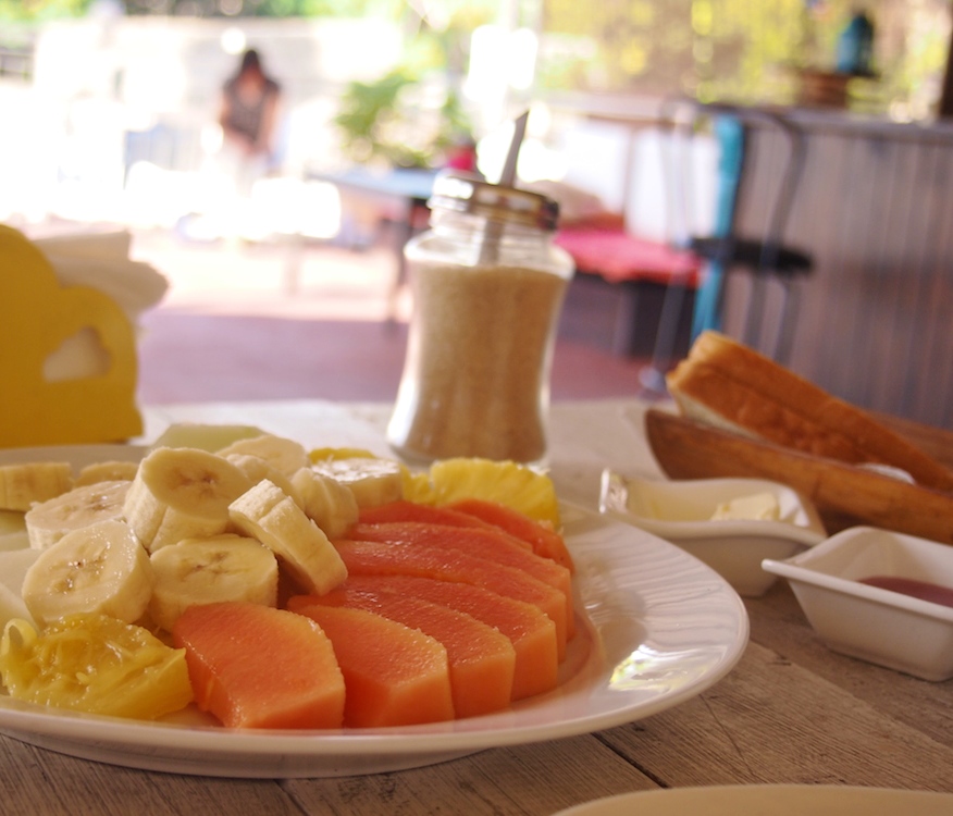 Aamupala tarjoiltiin rakennuksen kattoterassilla, missä oli pienen baarin lisäksi sänkymäisiä tasanteita. Paikan täti valmisti aamupalaa keskikerroksessa tyypillisen verkkaisesti, yksi annos kerrallaan. Aamupalalle kannattikin varata aikaa, sillä vaikka hostellissa oli alle kymmenen huonetta, ei aamupalatarjotinta kannattanut odottaa saapuvaksi kovin pian. Huolimatta siitä, että yleensä aamupalalla oli samaan aikaan korkeintaan kaksi muuta. Mutta jotenkin aamupalakin oli varsin hurmaava: cafe con lecheä, kolme paahtoleivän puolikasta, hilloa ja voita pienissä kupeissa, lautasellinen tuoreita hedelmiä sekä vajaa pieni appelsiinimehulasi. Hitaan toimituksen ja säteilevän hymyn kera!