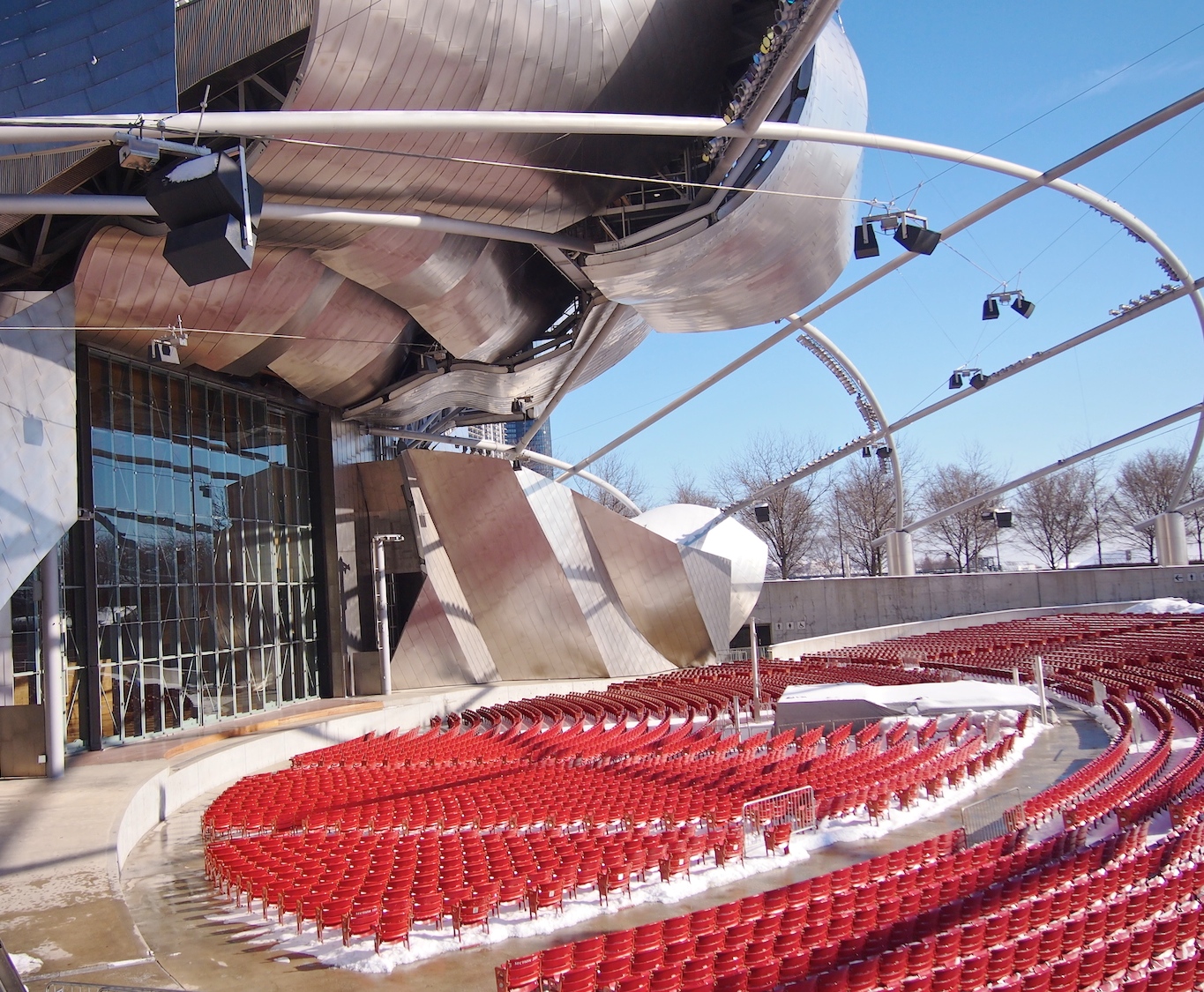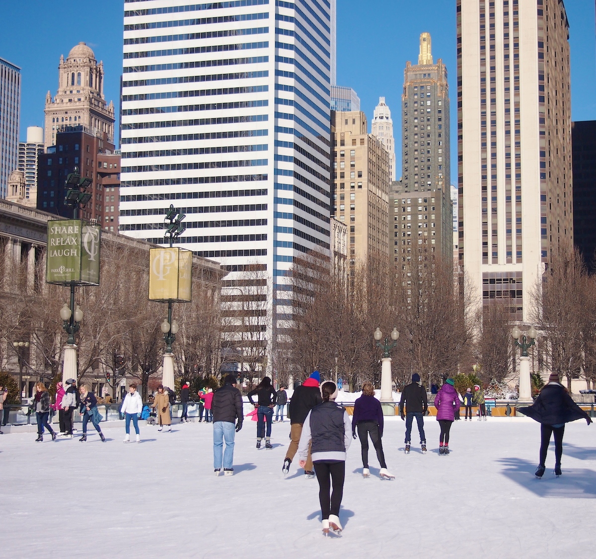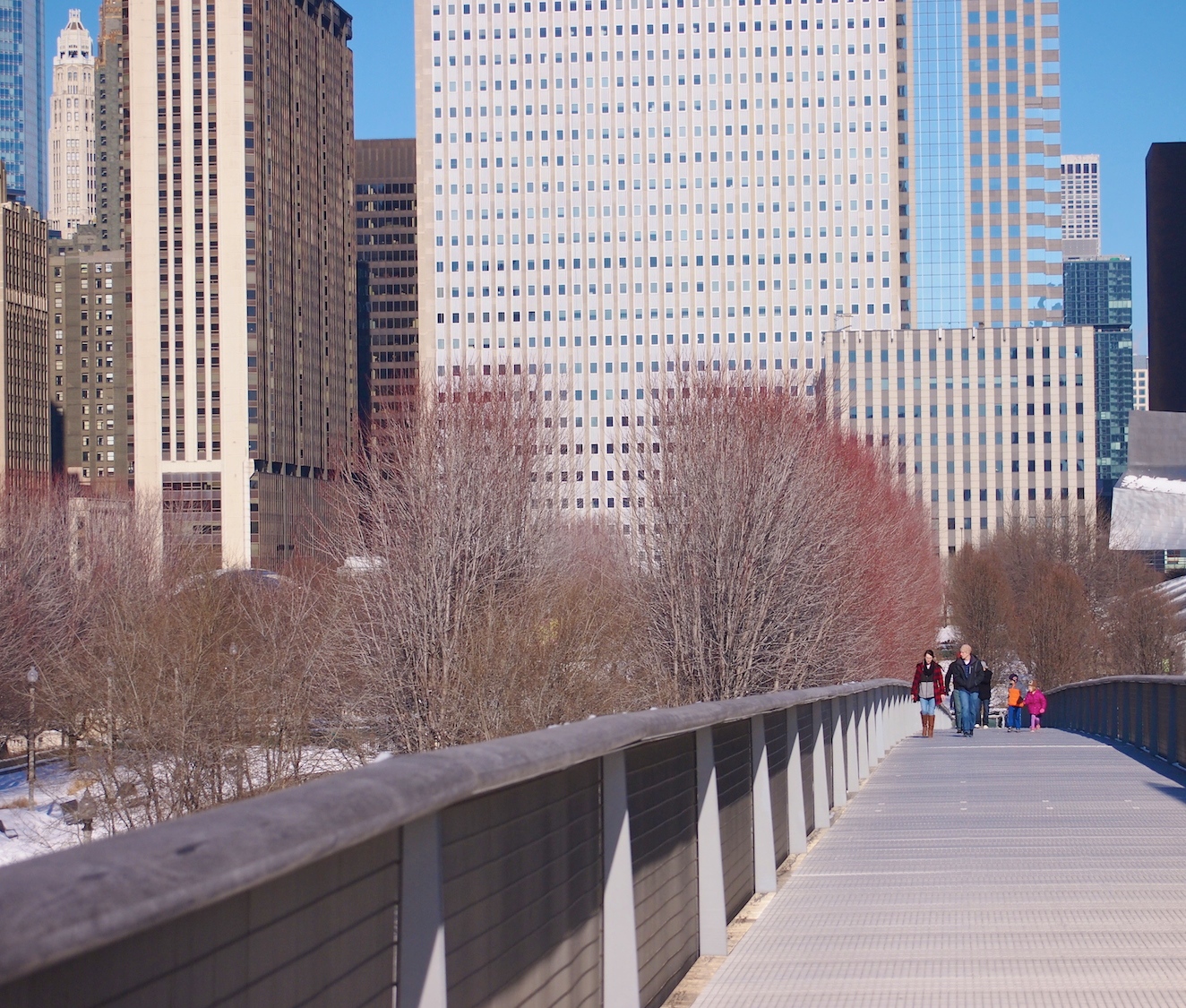 Mutta se keväinen hetki, silloin me satuimme kävelemään Millenium-puiston ohi ja vaikka talvinen puisto ei ollut kaupungin nähtävyyksistä listallamme ihan ykkösenä, oli se kuitenkin lopulta aika hauska kokemus. Puisto on varmasti erittäin vilkas paikka kesäisin, mutta kyllä porukkaa riitti myös keväisenä sunnuntaipäivänä. Mieleen jäi erityisesti luistinrata pilvenpiirtäjämetsän reunalla ja yläilmoihin tehty kävelytiesilta. Kesäisin avoinna oleva suuri näyttämö vetää varmasti paljon väkeä, vaikka nyt paikalla oli vain yksinäinen lumenluoja (miksi ihmeessä sieltäkin pitäisi talvella kolata lumet?).
