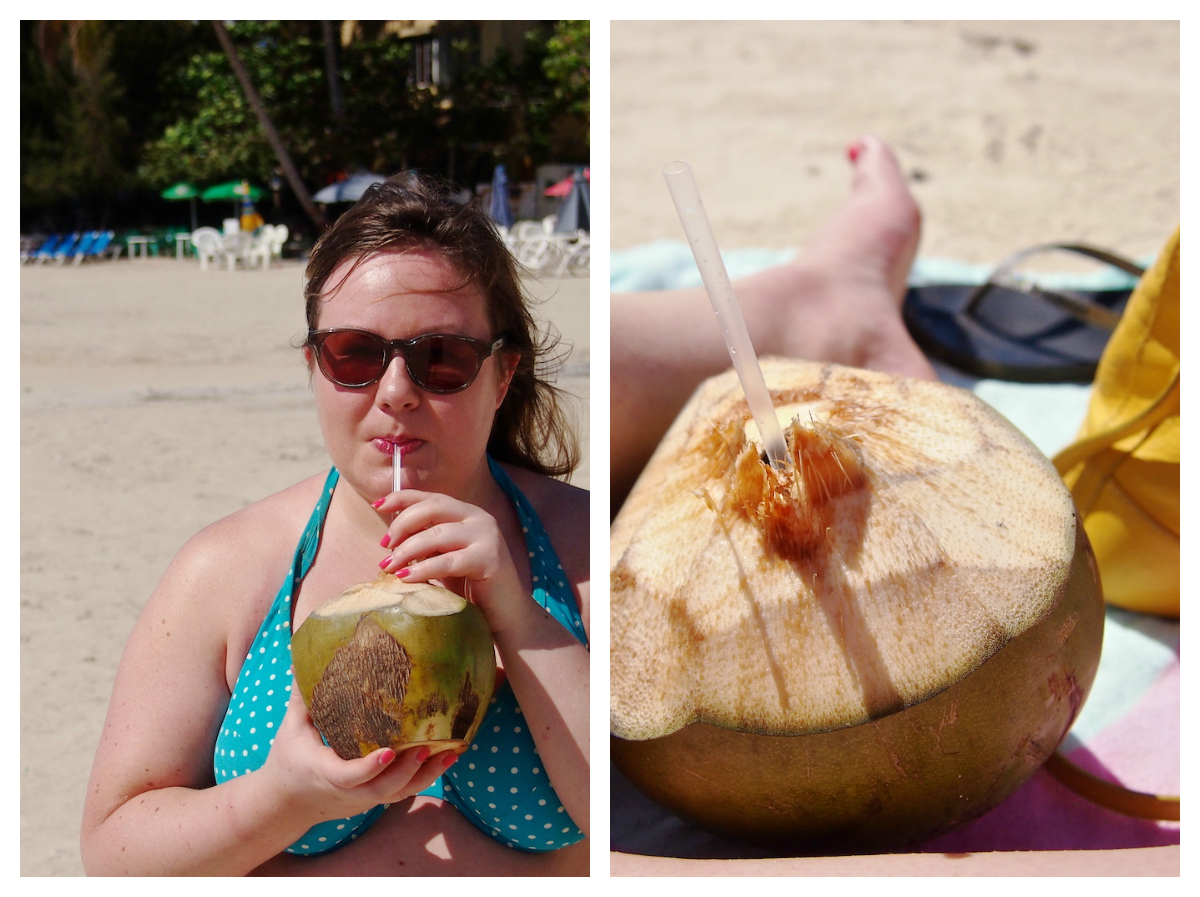 Rannalla kaupustellaan yhtä jos toistakin syötävää ja juotavaa (ja kaikkea muutakin). Suosittuja on ainakin kookospähkinät, joiden mehu juodaan pillillä suoraan pähkinästä. Kookospähkinä pillillä jos mikä on merkki siitä, että olet paratiisissa! Lisäksi rannalla kiertää mm. erilaisia meren eläviä myyviä kalastajia ja jänniä tikkarin näköisiä kirsikan punaisia juttuja myyviä poikia. Olisin halunnut ostaa yhden maistiaisiksi, mutta juuri sillä hetkellä en nähnyt enää yhtään myyjää.