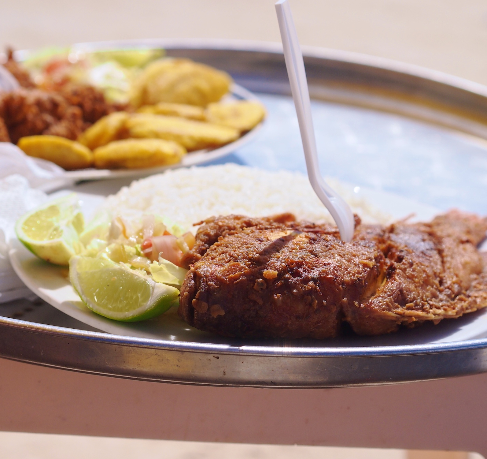 Me tilasimme yhden annoksen paistettua kanaa ja söimme sen puoliksi, mikä oli ihan riittävää lyhyelle rantapäivälle. Kun tulimme tiistaina uudemman kerran ja ranta oli huomattavasti rauhallisempi, halusin ehdottomasti tilata paistettua kalaa. Kala oli mielettömän hyvää, mutta osoittautui luultua kalliimmaksi. Kuten koko päivä ylipäätään.