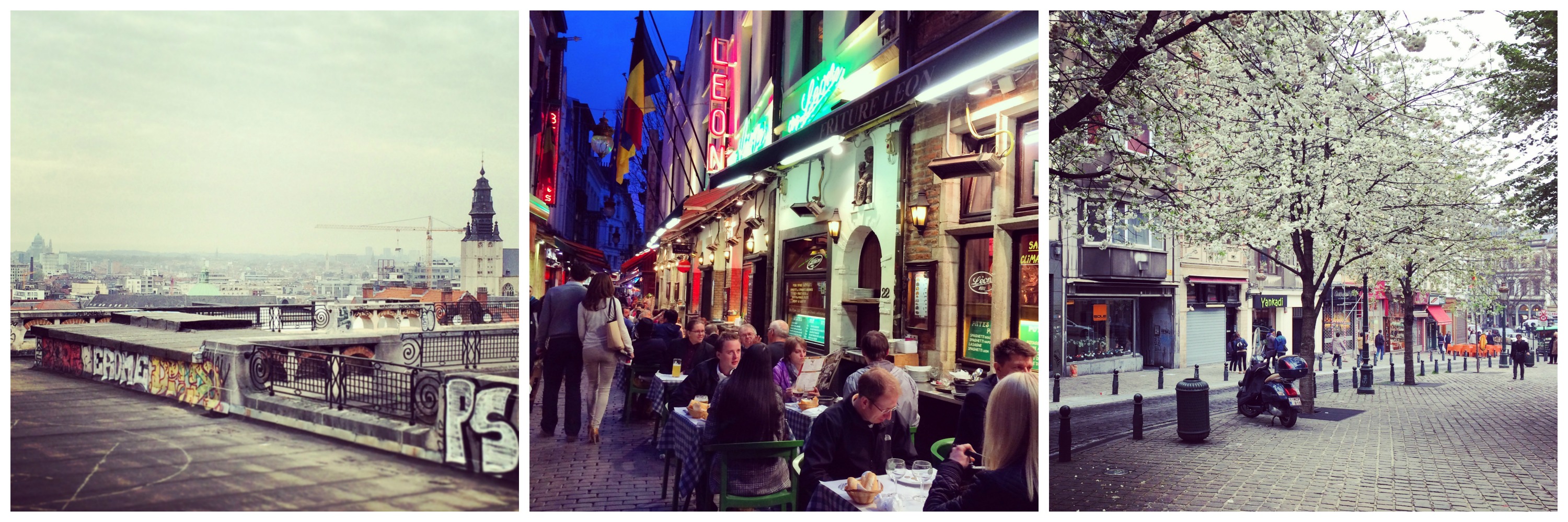 Pieni ennakkotutustuminen oli siis paikallaan ja latasin iPadilleni Mondon Brysselioppaan. Oppaasta kävi varsin pian selville, että syöminen ja juominen on juuri se juttu Brysselissä. Well, sopii minulle! Eikä ruokailujen suhteen tullut pettymystä, vaikka missasimmekin väsymyksessämme Chatelainin ruokamarkkinat, jotka olivat aluksi listalla ykkösenä. Mutta sen sijaan söimme kyllä ulkona useampaan otteeseen, ja siis kirjaimellisesti ulkona: Brysselin kevät helli meitä yli 20 asteen lämmöllä ja suloisella auringonpaisteella. Ihmiset olivat liikkeillä shortseissa ja t-paidoissa. Meillä sen sijaan oli koko ajan pieni hiki päällä, kun emme olleet ihan täysillä uskoneet ennusteita.