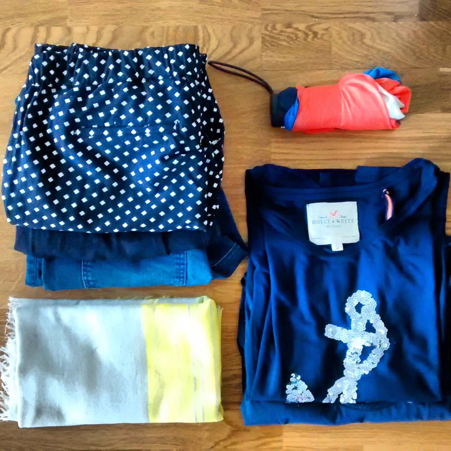 Vaatteissa yritän pärjätä näillä: kahdet rennot housut (tosin ne on samanlaiset keskenään, joten ei ehkä ole mitään järkeä ottaa molempia, mutta kun en osaa päättää ottaisinko pilkulliset vai mustat, joten tässä sitä taas ollaan…), trikoomekko, neuletakki, kaksi t-paitaa ja kävelykengät. Päälle lentokoneeseen tulee farkut, t-paita ja neuletakki, ulkotakki, kaulaliina ja tennarit. Näillä vaatteilla voisi kyllä pärjätä viikonkin, jos ei sotke niitä ja ei pidä peräkkäisinä päivinä, että ne saa hieman tuulettua.