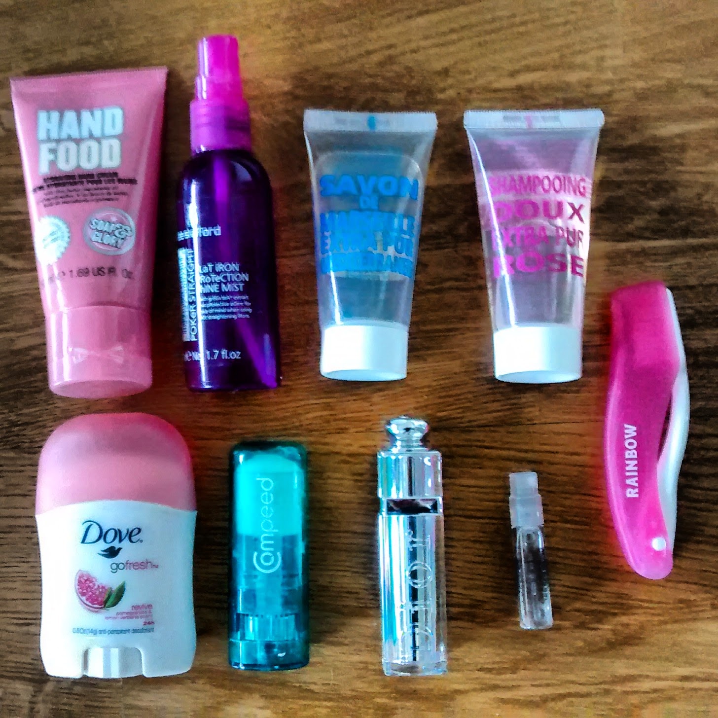 Matkalaukkuun kertyy yleensä painolastia kaikenlaisista purkeista. Pyrin kyllä ottamaan kaikista mukaan matkakoot ja niissäkin miettimään mitkä kaikki on tarpeellisia. Ilman käsivoidetta ei kannata lähteä minnekään, sillä viimeksi kun tein niin, jouduin lopulta hankkimaan melko kalliin yksilön lentokentän kaupasta, kun kädet halkeili niin pahasti juuri ennen koneeseen siirtymistä. Ne ei olis kestäny sitä lentoa! Mukana pitää olla myös lempihuulipuna, se söpö pieni matkadödö, näytekokoinen hajuvesi, rakkolaastareita ja muita tykötarpeita (tässä puikko), shampoo, marseille-saippua ja hiusten selvitykseen Bootsista ostettu suihke. Matkahammasharjana minulla on aina Rainbown kätevä yksilö (ei kylläkään aina sama, heh), joka ei tarvitse erillistä koteloa ja menee pieneen tilaan.