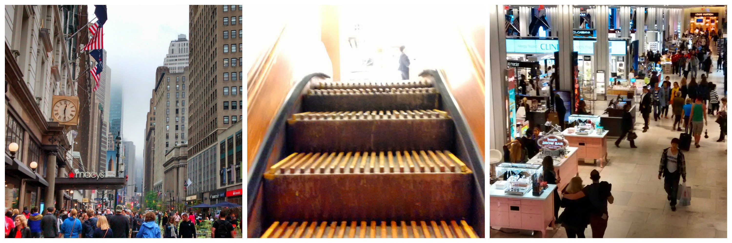 Perillä nousimme metrosta kätveästi Manhattan Mall:n edessä, joten piipahdimme sisään ostamaan vielä puuttuvat VS:n alustvaatteet ja Sephoran meikit. Sen jälkeen päätimme mennä hieman lepäilemään ja pikaiselle lounaalle Macy’sin eli Macyn putiikin yläkertaan. Osa tavaratalon portaista on ihania puisia, osa tosi kapeitakin!