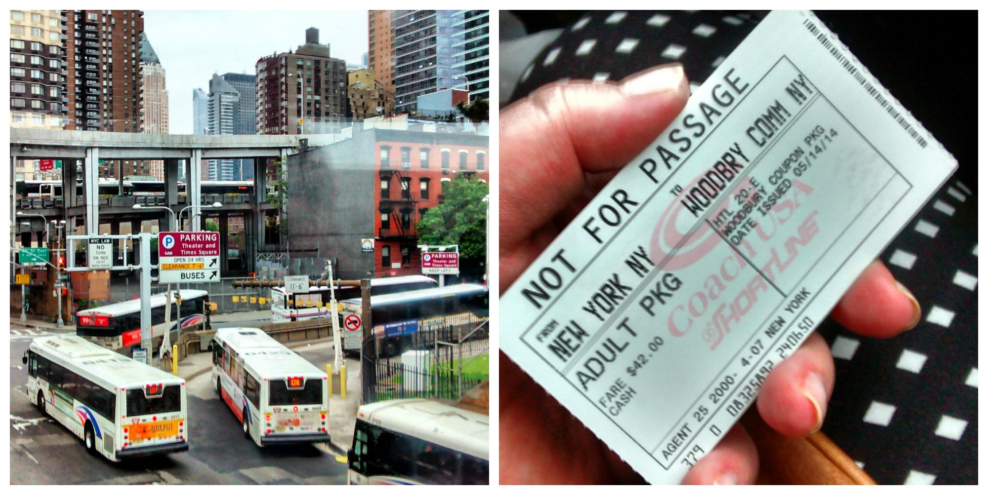 Woodburyyn matkustaa kätevimmin bussilla. Tai no en tiedä voiko bussista ja kätevästä puhua samassa lauseessa, sillä lähes koko homma oli melko sekavaa. Ensinnäkään emme löytäneet mistään ennakkoon tietoa, mistä bussiliput voi ostaa linja-autoasemalla (Port Authority). Menimme sitten etsimään sopivaa luukkua sitä löytämättä ja infopistekin oli kiinni. Asemalla oli ihan mieletön ruuhka ja se hermostutti entisestään. Löysimme sitten avoinna olevan infon, josta saimme tiedon mennä ulos ja vasemmalle viereiseen rakennukseen, toiseen kerrokseen. Helpotti kummasti ja lippuluukku löytyi. Portti 310 oli myös vain raput kolmanteen kerrokseen ja perillä oltiin, yli puoli tuntia ennen bussin lähtöä, eikä jonoa ollut juuri nimeksikään.
