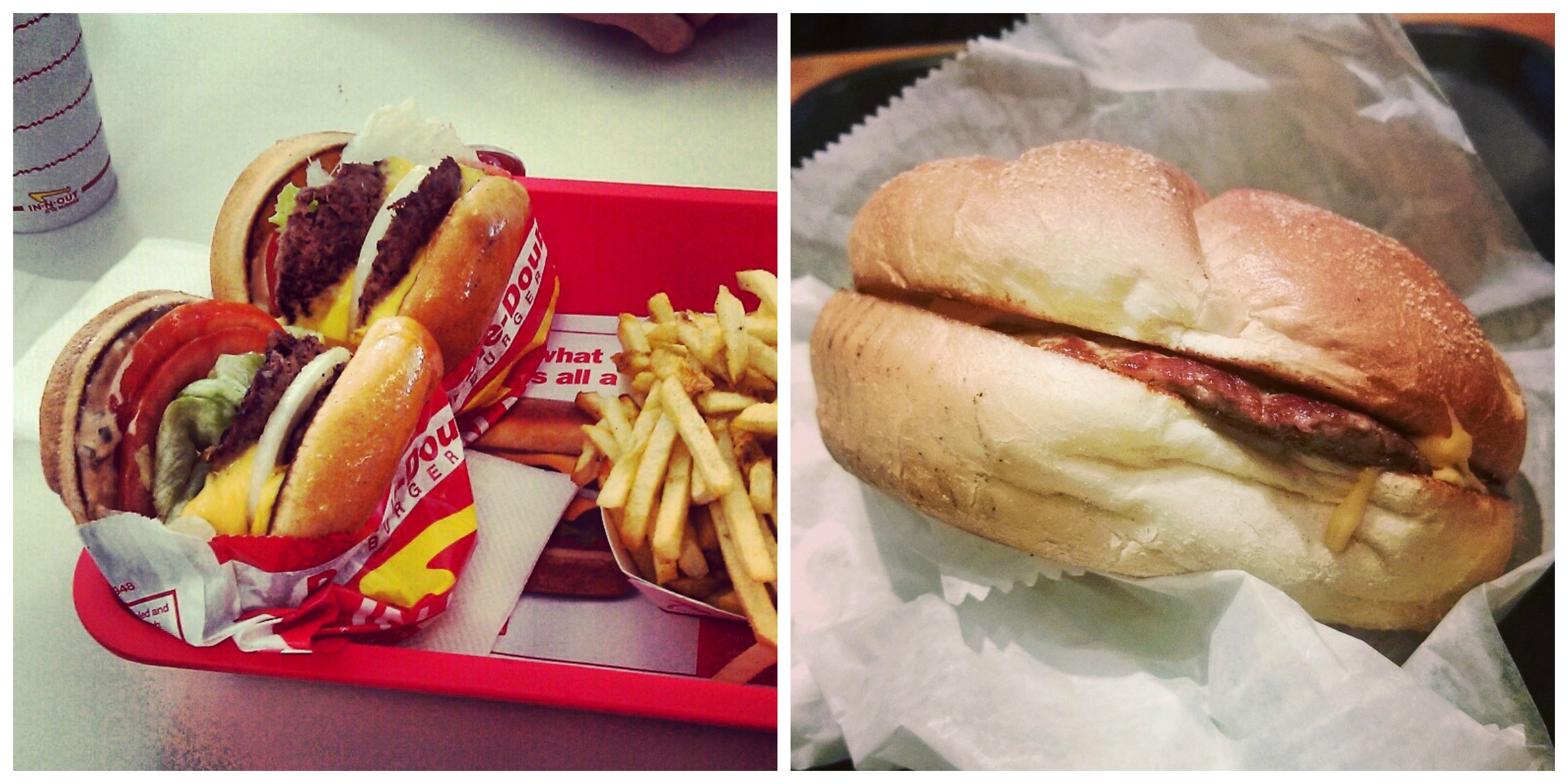 Ja puhuttaessa hampurilaisista, jatketaan In-N-Outin double double fiilistelyillä (kuvassa vasemmalla). Näitä ehkä maailman parhaita hampurilaisia piti yrittää grillailla itsekin viime kesänä, kun kotiuduimme road tripiltä. Oikeanpuoleista cheezborgeria (Billy Goat Tavern, Chicago) ei tehnyt mieli kopioida ihan suoraan, sillä se oli melko kuiva, mutta kotona tuli loihdittua mehukkaampi versio samalla idealla.