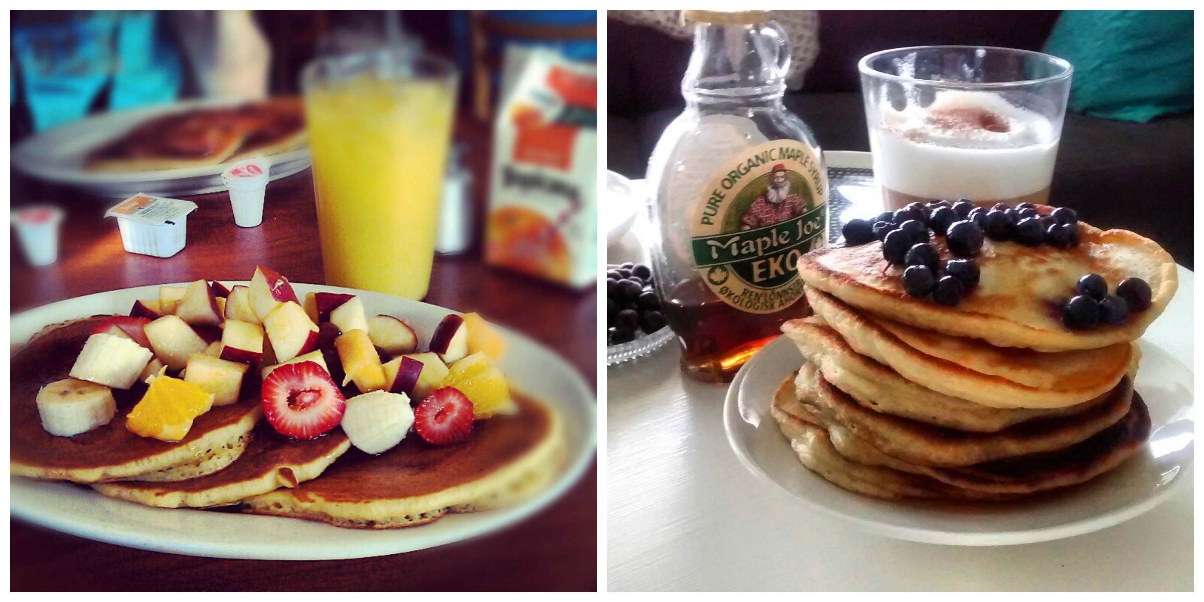 Aloitetaan aamupalasta! Diner-pannarit ovat lempiherkkuamme, runsaalla vaahterasiirapilla ja hedelmillä/mustikoilla. Park Slopessa sijaitsevan lempparidinerimme tunnelmaa ei ehkä saa ihan aikaiseksi kotona (siihen tarvittaisiin vähintäänkin yksi harmaantunut kreikkalainen mies, joka kulkisi ympäriinsä kahvipannu kädessä ja kuulumisia vaihtaen), mutta mustikkapannarit syntyy sen sijaan käden käänteessä. Viikonloppuaamu ei voi enää alkaa paremmin!