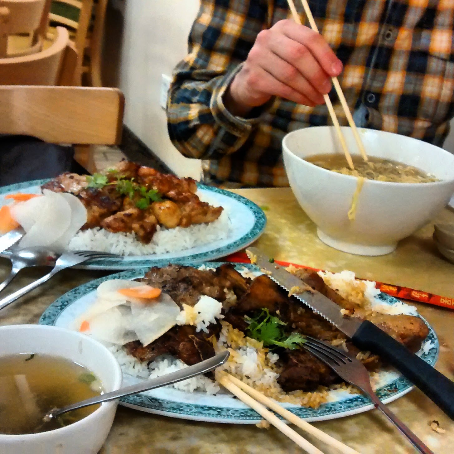 Toukokuussa saimme myös päähämme, että mitä jos hyppäisimme illan suussa metroon, ajaisimme ensimmäisen reissun hotellimme kulmille Chinatowniin ja menisimme syömään siihen yhteen vietnamilaiseen ravintolaan, jonka nimestä meillä ei ole hajuakaan. Näin myös teimme ja jostain syystä retki tuttuun ravintolaan oli jopa jännempi kuin vierailut uusissa paikoissa. Paikka oli edelleen aasialaisten hallussa, enkkua ei kuulunut kovin monesta pöydästä ja omistajien sukua oli syömässä omia eväitään yhden suuren pöydän verran. Ruoka oli todella hyvää ja edullista!