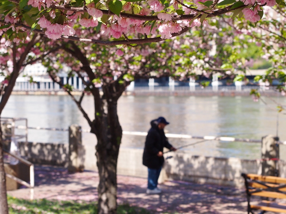 Perillä meitä odotti vaaleanpunainen yllätys: kirsikankukat olivat vielä osittain puussa, osittain maassa. Voi sitä onnea! En ollut uskonut, että pääsisimme ihastelemaan kirsikankukkia omalla toukokuun puoliväliin sijoittuvalla reissullamme, mutta toisin kävi, mikä tuuri! Rippeitähän nämä enää oli, mutta minulle ensimmäinen hanami!