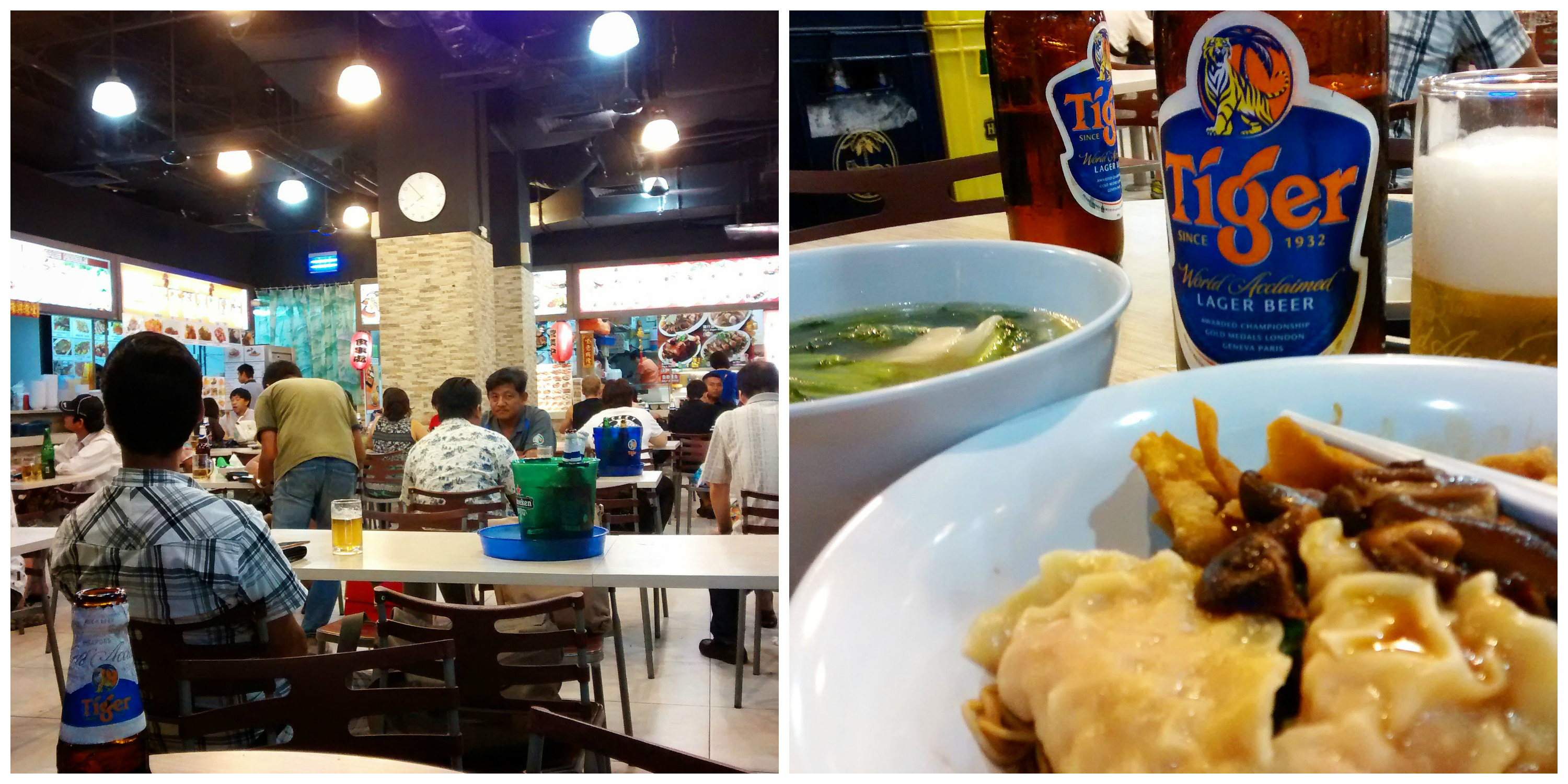 Ostarilta lähdettäessä törmäsimme pienehköön hawker centreen, joka oli tietenkin ihan täydellinen meidän illallistoiveisiin nähden: nopeaa katuruokaa ja isot kylmät kaljat ennen kuin väsymys iskee ihan täysillä päälle. Menimme aika umpimähkään yhden kojun kohdalle ja tilasimme laksa-keiton, mutta se oli päässyt loppumaan. Sen sijaan otimme sitten wonton-keiton ja jotain, mitä myyjämummo suositteli olevan ”very good”. Otettiin tällä kertaa kaikki ei-tulisina, sillä nenäliinat oli jääneet hotellille ja pari päivää jyllänneen flunssan takia räkämäärä olisi voinut olla melkoinen, eikä niihin aasialaisiin, mahdollisesti tarjolla oleviin riisipaperihärpäkkeisiin voi niistää nenäänsä!