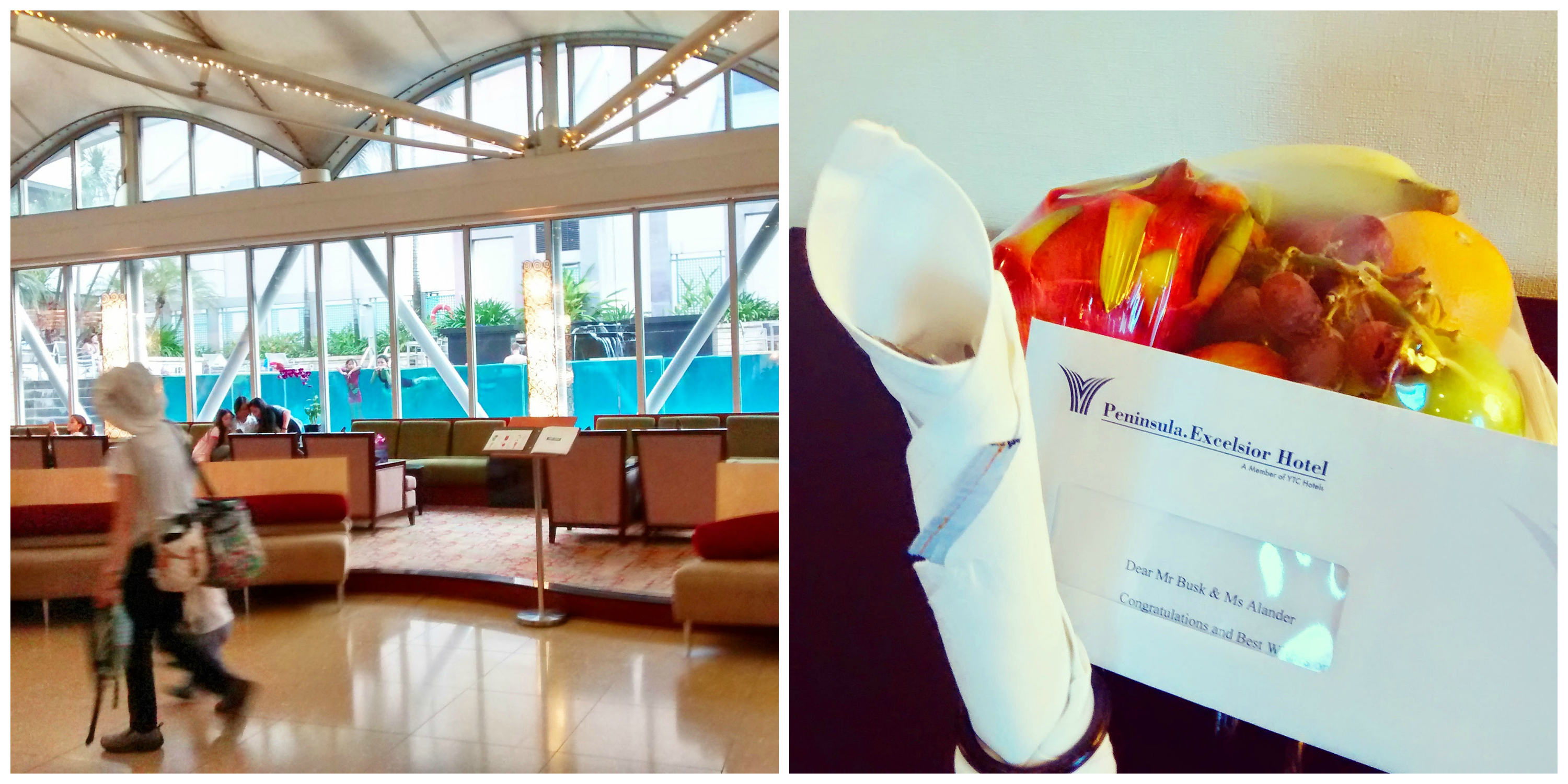 Hotellimme Peninsula Excelsior sijaitsi niin kätevästi City Hall -aseman vieressä, että löysimme sen välittömästi. Kannatti muuten ilmoittaa hotellille olevamme häämatkalaisia, sillä saimme ilmaisen upgraden seuraavaan huonetyyppiin ja lisäksi huoneessamme odotti onnittelukirje ja hedelmälautanen! Ja vitsi millainen huone, näkymät ei ainakaan voisi olla paremmat 14. kerroksesta: suoraan Marina Bayn alueelle ja osittain pilvenpiirtäjäryppääseen. Ja itse huone on tilava ja ikkunatkin on kahdelle suunnalle. Kyllä kelpaa viettää täällä kolme yötä!