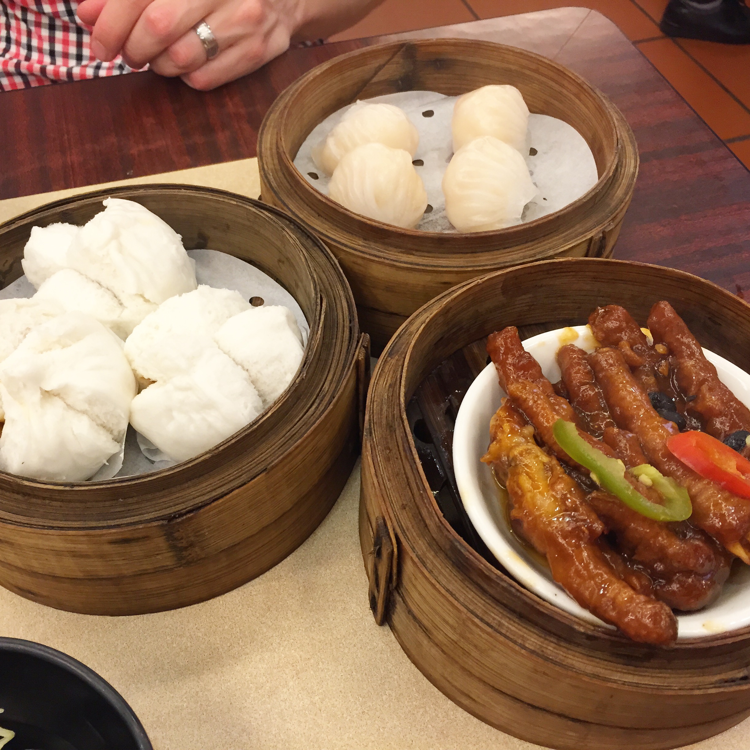 Victoria Peak oli aika lailla sitä mitä odotettiinkin, otettiin muutamat kuvat ja ihailtiin näkymiä varsinaisen näköalatasanteen vierestä ja lähdettiin paluumatkalle. Kun pääsimme takaisin Kowloonin puolelle, menimme syömään dim sum -lounasta. Paikka oli täynnä paikallisia ja vaikka ruokalista oli myös enkuksi, niin emme osanneet kuitenkaan merkitä omia valintojamme kiinankieliseen tilauskuponkiin. Tilasimme tarjoilijalta enempää miettimättä mm. herkullisen näköistä kanaa, joka osoittautui myöhemmin kanan jaloiksi. Ei siis koiviksi vaan varpaiksi, mitä Aasiassa nyt tietty syödään ihan yleisesti. Meille ei kyllä oikein auennut, mitä hyvää niissä on, sillä nahka ja rustot eivät nyt ole ihan lempiherkkujamme. Muut ruuat upposivat kyllä paljon paremmin!