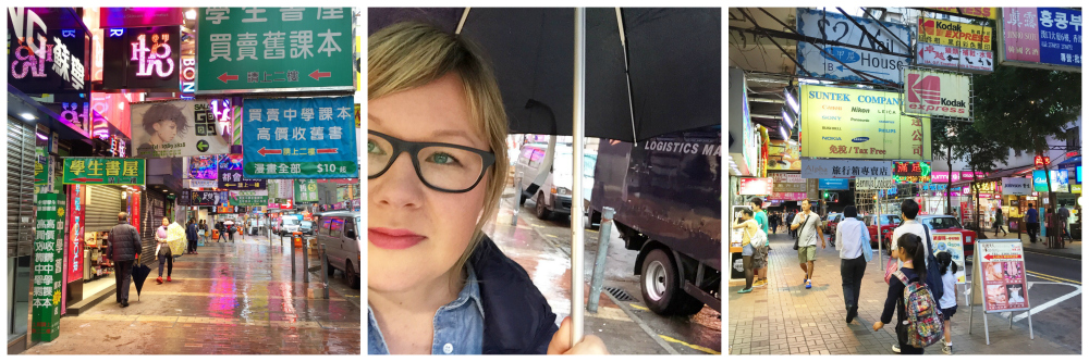 Huhtikuisen Hongkongin kadut olivat täynnä värejä ja yksityiskohtia. Siinä missä suurkaupunki näyttää kaukaa katsottuna jokseenkin seesteiselle, paljastaa lähempi tarkastelu muurahaispesämäisen vilinän ja vieri vieressä olevat pikkukaupat, jotka kaikki myyvät lähes samoja tuotteita. Toisaalla kimaltavat kullanväriset muovikissat, toisaalla neonväriset mainoskyltit. Hongkong oli juuri sitä mitä odotettiinkin ja vaikka vettä ei varsinaisesti toivottu, niin kaupunki näytti kevyessä sateessa vieläkin kauniimmalle!