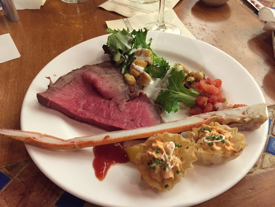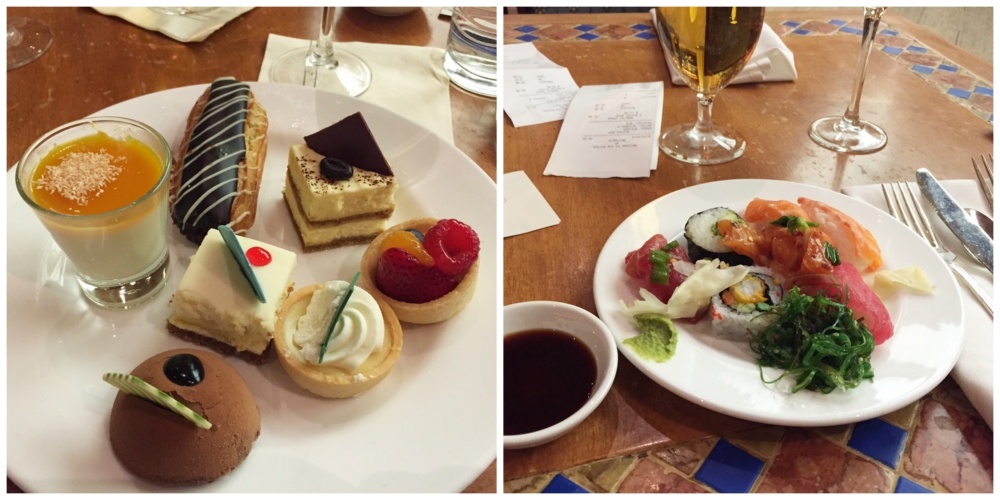 Bellagion buffassa oli ruokia eri maittain: Amerikka, Japani, Italia ja Kiina. Näiden lisäksi tarjolla oli seafoodia. Aloitin itse sushista ja jatkoin lumitaskuravunjalkoihin ja kobe-härkään ja johonkin muuhun lihaan, jota leikattiin kivan ohuiksi siivuiksi. Ruoka oli hyvää, mutta kuten aina buffetissa, epäilen että a la carte -annoksina kaikki olisi ollut parempaa. Jälkiruokapöytä sen sijaan sai minut suorastaan villiksi, vaikka yleensä olen suolaisten alkupalojen ystävä. Säästin mahaani kerrankin jälkkäreille ja lastasinkin innoissani lautaselleni yhtä jos toista. Häpeäkseni en sitten jaksanut syödä kaikkia, mutta pidin erityisesti tuosta suklaisesta jutusta. Lopulta kaksi tuntia (mikä oli aikaraja) buffassa meni ihmeen nopeasti.