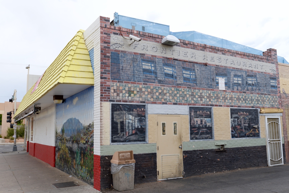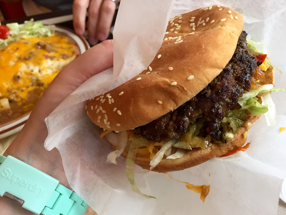 Matkan varrelle osui myös yksi Man v. Food -paikka, tottakai! Kävimme Albuquerquessa Frontierissa, ja vaikka se reissu ei onnistunut ihan kympillä noin niinkuin muuten, niin söin kyllä siellä todella hyvän hampurilaisen! Fiesta burgerin välissä oli mm. vihreää chilikastiketta, joten se teki siitä ehtaa newmexicolaista ruokaa. Antin ”syömähaaste” burrito oli hyvä kans, mutta kyllä hampurilainen aiheutti melkoista annoskateutta! Ja kutsuimme tuota syömähaasteeksi siksi, että annos näytti lautasella suurelta, mutta oli kyllä käytännössä ihan normaalikokoinen.