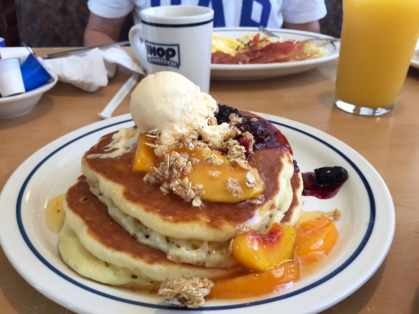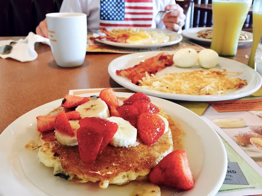 Motellimajoituksiin kuuluu monesti jonkinlainen aamupala, mutta ei onneksi aina. Joinakin aamuina pääsimme syömään perinteistä dineraamupalaa ja sehän sopi meille paremmin kuin hyvin. Ensimmäisenä menimme IHOPiin, jossa olimme käyneet kerran myös aikaisemmalla reissulla. Munat, pekoni, röstiperuna ja pannukakut onkin sellainen annos, että sillä pärjää iltaan saakka. Minä valikoin pannareista kesäsesonkimaun, joka oli todella överi, mutta aika makeita taitaa paikan muutkin annokset olla.