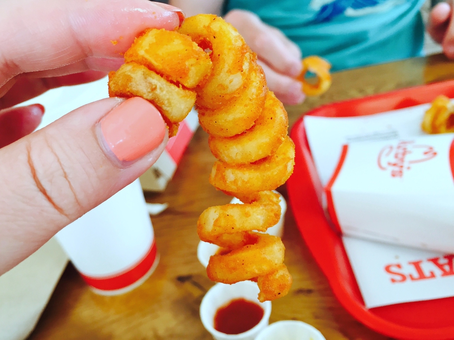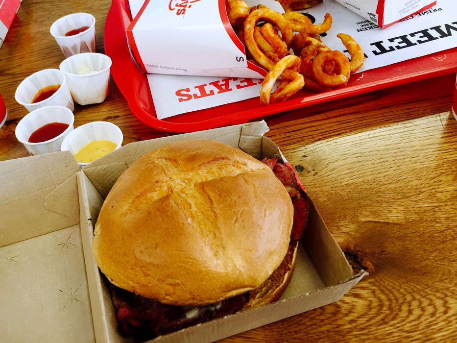 Lisää ketjupaikkoja: Arby’s. Olimme syöneet siellä kerran aikaisemmin ja kärsin silloin kovasti annoskateudesta Antin herkutellessa Smokehouse Brisket -sandwichillään. Vahinko korjattiin tällä reissulla ja minäkin pääsin upottamaan hampaani suht ruman näköiseen hampurilaiseen, mutta yksinkertaisella tavalla hyvään. Aterian kruunasi vielä kiharat ranskalaiset, jotka toivat minulle muistoja mieleen vuosien takaisesta Iowan isäntäperheestäni. Ja ranskalaisia pääsee dippaamaan ketsupin lisäksi neljään eri dippiin, joista piparjuuri nousi meidän ehdottomaksi suosikiksi!
