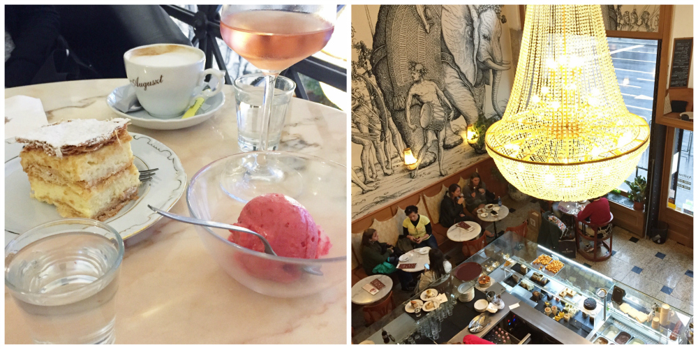 Itapäivästä lähdimme etsimään kivaa vanhaa charmia henkivää kahvilaa ja löysimme sellaisen lopulta ihan hotellimme läheltä. Auguszt Cukraszda oli sulkemassa oviaan tunnin päästä, joten tiskissä ei ollut enää ihan täyttä valikoimaa ja jouduimme jakamaan viimeisen kermaleivoksen, joita olimme tilanneet kaksi. Mutta olipa herkullista! Lisäksi tilasimme pallon itse tehtyä vadelmasorbettia.