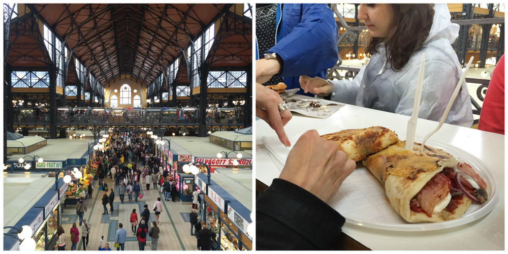 Hotellimme hintaan kuului aamupala läheisessä kahvilassa, joten lähdimme liikenteeseen joka aamu sen voimin. Sitten saikin kierrellä kaupungilla hyvän tovin, ennen kuin nälkä alkoi yhtään kolkutella vatsaa. Lauantaina halusimme vierailla Budapestin suuressa kauppahallissa ja sen lisäksi, että ihailimme rautatieasemaa kooltaan ja ulkonäöltään muistuttavaa rakennusta, päätimme testata paikan lounastarjonnan. Toisen kerroksen ravintolat pystypöytineen olivat äärimmäisen täynnä, mutta päädyimme silti jonottamaan niistä ehkä suosituimpaan, joka myi unkarilaisia täytettyjä lettuja, langoseja. Tilauksen kanssa meillä kävi pieni viba, sillä epähuomiossa nyökyttelimme kyllä kyllä ihan jokaisen lettuun tulevan täytteen kohdalla ja lopulta meillä oli edessä valtaisa ja paikallisittain melko hintava langos. Onneksi emme sentään olleet tilanneet molemmille omia! Hyväähän se oli, mutta emme kyllä lopulta jaksaneet syödä yhtä lettua edes puoliksi.