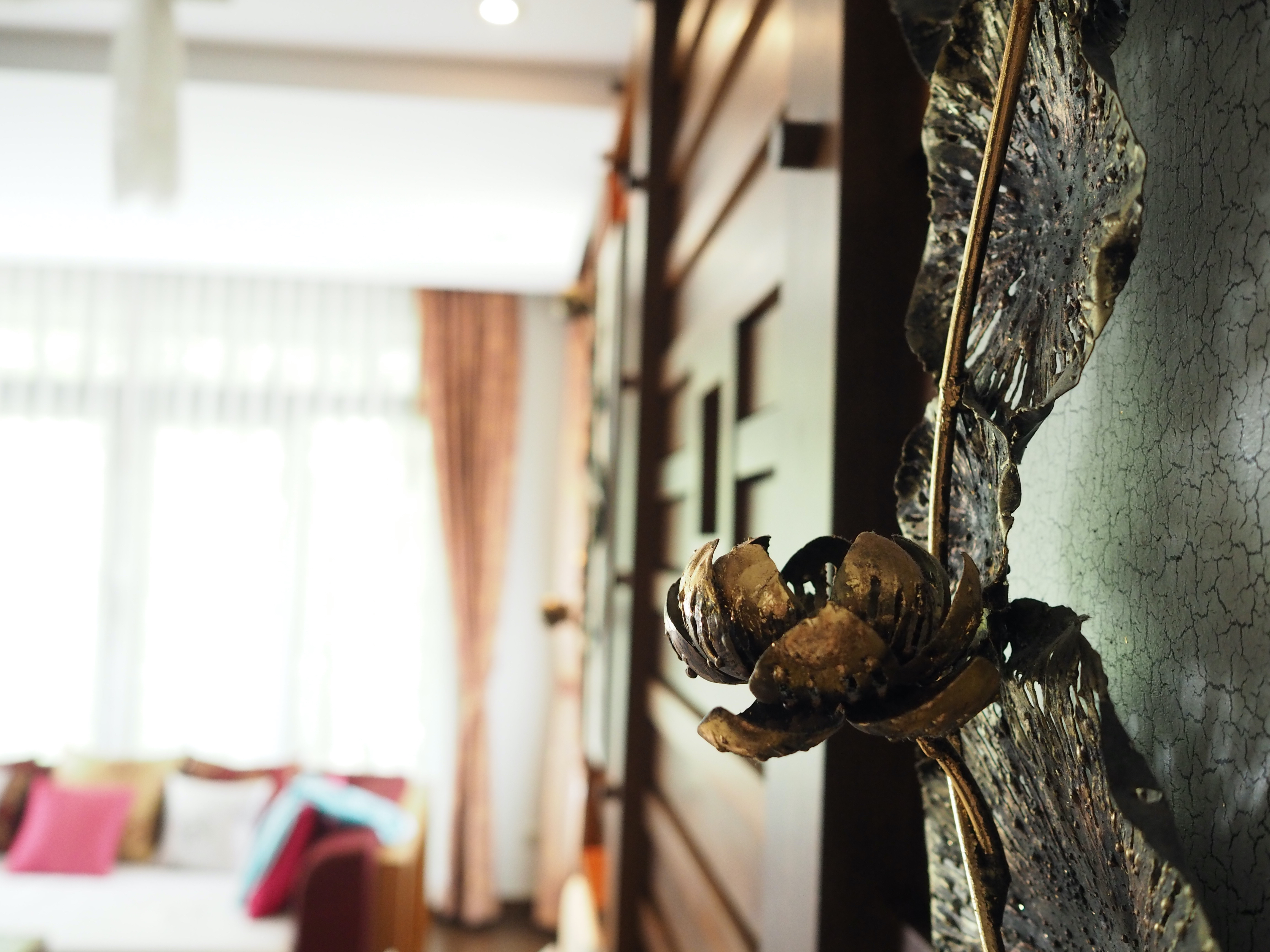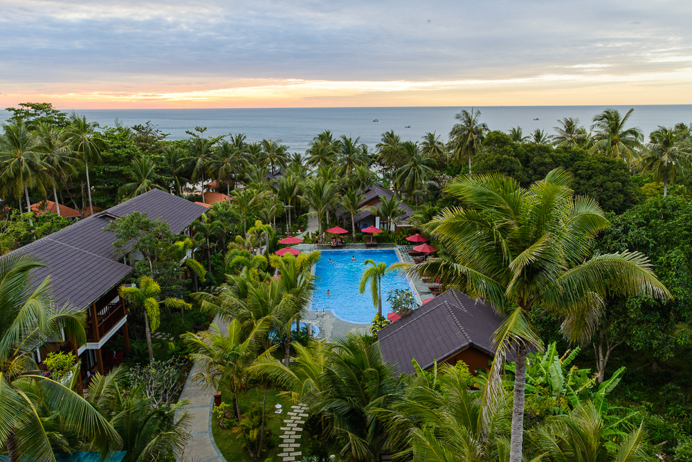 Joskus (tai aika useinkin) hotellia valitessa kannattaa valita joku pieni ja persoonallinen, joka on kuitenkin saanut hyviä arvioita. Ja sitten ottaa hotellin paras huonetyyppi. Tämä on kyllä yksi kauneimmista hotellihuoneista, missä olen yöpynyt! Ja tilaa oli paljon. Melkein kuitenkin jouduimme luopumaan tästä huoneesta, sillä menin heti ensimmäisenä huoneeseen saavuttuamme vessaan. Tultuani pois, onnistuin jotenkin lukitsemaan oven niin, ettei sitä saanut enää auki. En siis onneksi itse jäänyt sisään, mutta koska oli jo lähes yö, niin vessan lukkiutuminen ei ollut mikään kovin hilpeä juttu. Onneksi pieni hotelli ei ollut ihan täynnä, ja pääsimme heti vaihtamaan väliaikaisesti ylimmän kerroksen parvekkeelliseen huoneeseen, joka ei kuitenkaan ollut varaamamme sviitin veroinen. Seuraavana päivänä korjaaja tuli heti aamusta paikalle ja näin pääsimme vaihtamaan tavaramme takaisin omaan huoneeseemme. Kävimme Vietnamissa myös Phu Quocin saarella, missä majoitus valittiin lähinnä näköalallisin perustein, mutta sitä näkymää kelpasikin sitten katsella auringonlaskun aikaan illalla omalla parvekkeella.