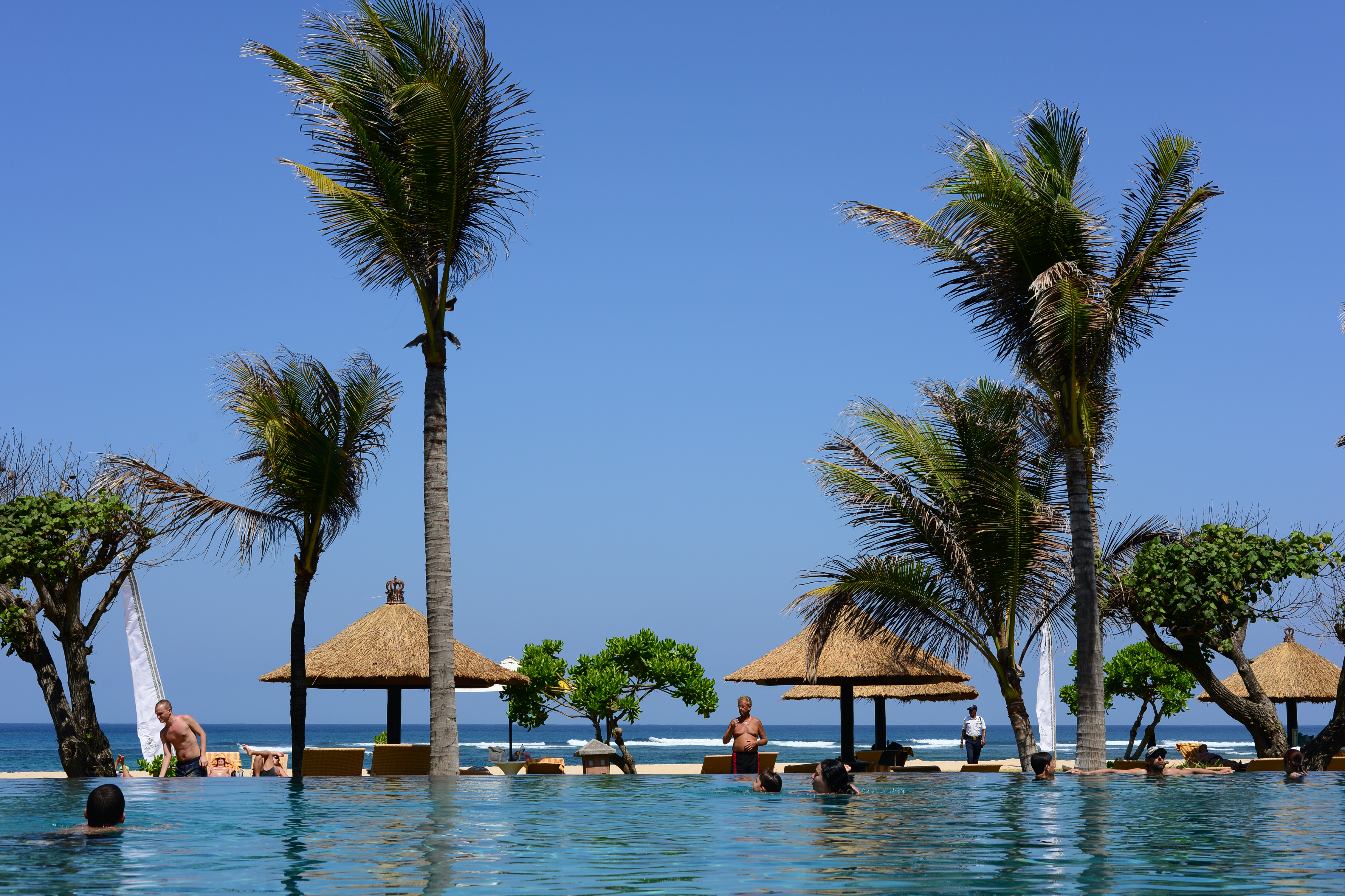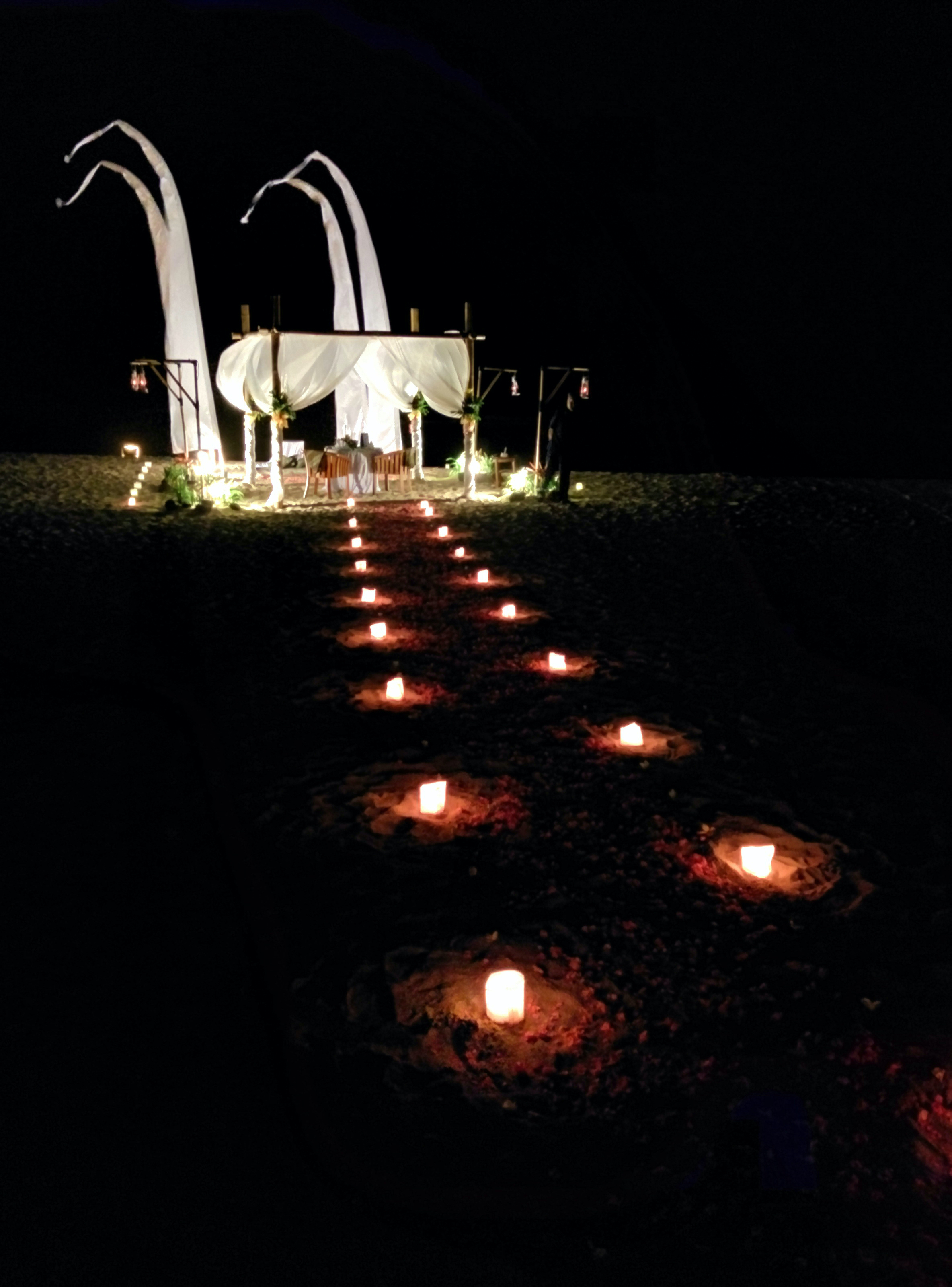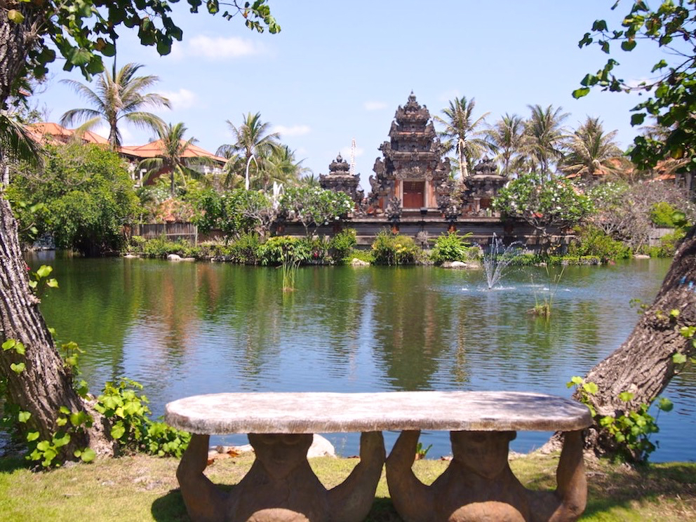 Häämatkan toinen kohde oli Bali, ja Singaporen jälkeen halusimme vain rentoutua. Ayodya (entinen Hilton) viehätti Bali-henkisellä tyylillään, hyvällä aamupalallaan ja tunnelmallisilla huoneillaan. Hotellilla oli myös oma ranta ja rannalla infinity pool. Alueen keskellä sijaitsi laguuni, jonka ääressä syötiin myös aamupalaa. Samalla saimme ihailla saarekkeilla ja kivillä lepäileviä iguaaneja. Häämatkafiiliksen kruunasi yllätys, jonka järjestin Antille hotellin kanssa: illallinen pimeällä rannalla, kynttiöiden ja lyhtyjen valossa. Meillä oli oma kokki ja tarjoilija ja lopuksi katselimme tähtiä oman nuotion ääressä. Tosin yllätys meni melkein pilalle viime metreillä, sillä olin ymmärtänyt henkilökunnan puheista, että heistä joku tulee hakemaan meidät huoneelta. Odottelimme huoneessa, minä yritin pelata aikaa, ettei paljastuisi miksi emme olleet jo lähteneet syömään kylille. Pyysin Anttia ottamaan meistä kuvia ihan loputtomia määriä, en muka ollut niihin tyytyväinen. Lopulta puhelin soi ja saimme kutsun tulla suoraan rannalle. Antti ei kyllä missään vaiheessa aavistanut yhtään mitään!