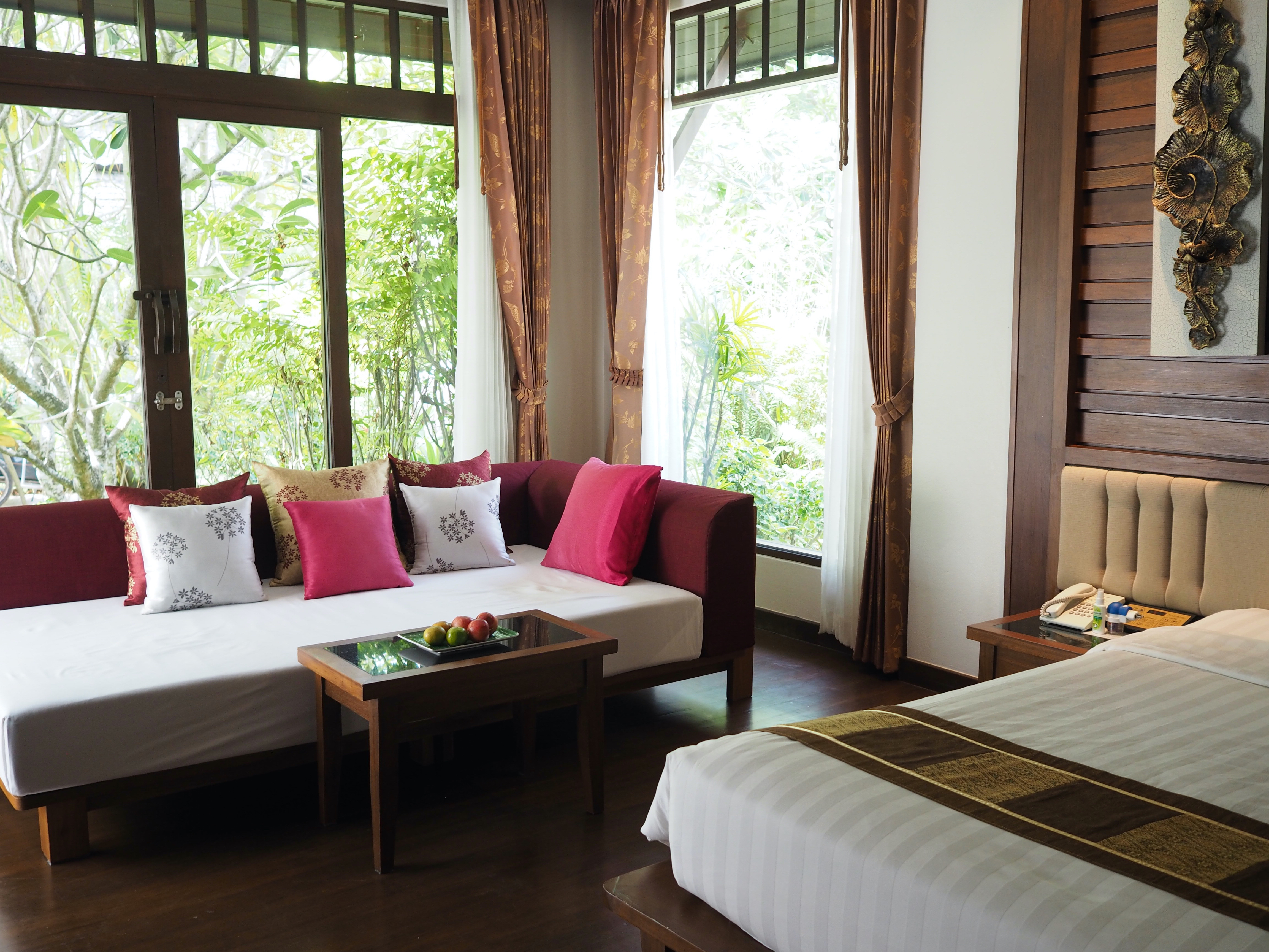 Railayn majoitus valittiin sen perusteella, että budjettiin mahtui astetta parempi villa, jossa oli mm. oma jacuzzi. Ja ihan viehättävä ja tilava majoituksemme olikin, erityisen hauskaa oli pieni laattapolku, jota pitkin villaan käveltiin. Hyvätasoinen majoitus oli varsin kannattava valinta myös siinä vaiheessa, kun viimeisenä päivänä vatsojamme alkoi vääntää ihan toden teolla: kyllä sitä kuumeen ja vatsataudin kourissa mieluummin oli kauniissa huoneessa kuin vähän alkeellisemmassa majassa.