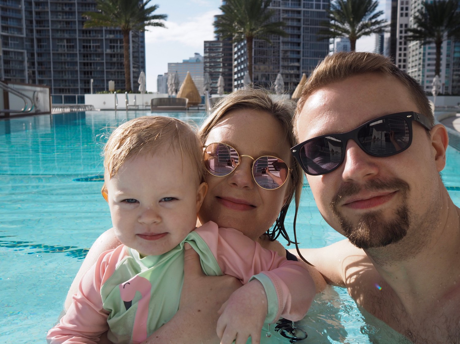 Viimeinen ulkomailla vietetty hotelliyö ennen koronaa tuli tehtyä ihan tyylillä Miamin keskustassa. Kimptonissa pääsimme heti alkuun kokeilemaan ensimmäistä kertaa valet-parkkia. Ihailimme upeita auringolaskun maisemia hotellin kattouima-altaalla, mutta palasimme pian todellisuuteen: leikkipuistoon oli päästävä, tai taapero hyppäisi kohta kaiteen yli kyllästyttyään tyylikkääseen atmosfääriin. Kävimme myös ostamassa iltapalaa ja valmiiksi myös aamupalaa Publixista, vain huomataksemme, että jääkaappimme (öh, minibaarimme) oli ihan lämmin. Ahdoimme sitten kaiken menemään. Lapsen nukahdettua saimme nautiskella öisestä kaupunkinäkymästä parvekkeella, saattoipa meillä olla jotain juomaakin. Ei yhtään huono viimeinen ilta! Heräsin jouluaattoaamuna ennen muita ja lähdin lenkille, samalla nappasin Subwaysta aamupalaa, kun en huomannut muita auki olevia paikkoja (dejavu vuoden 2012 jouluun Miamissa). Ennen lähtöämme ehdimme pulikoimaan uima-altaassa, lähettäen jouluterveiset suoraan altaasta käsin. Autoa jouduimme odottamaan noin tunnin. Että ei ehkä oltu kovin korkealla siellä prioriteettilistalla.
